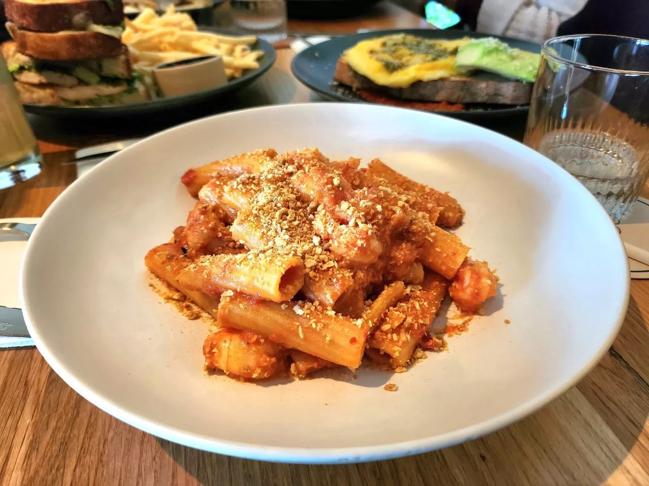 Next was the Grilled Chicken Sandy ($19): juicy chicken breast sauced in pesto with white cheddar and charred broccoli between toasted, thick-cut slices of sourdough. Spicy Shrimp Vodka Rigatoni Nick Reynolds