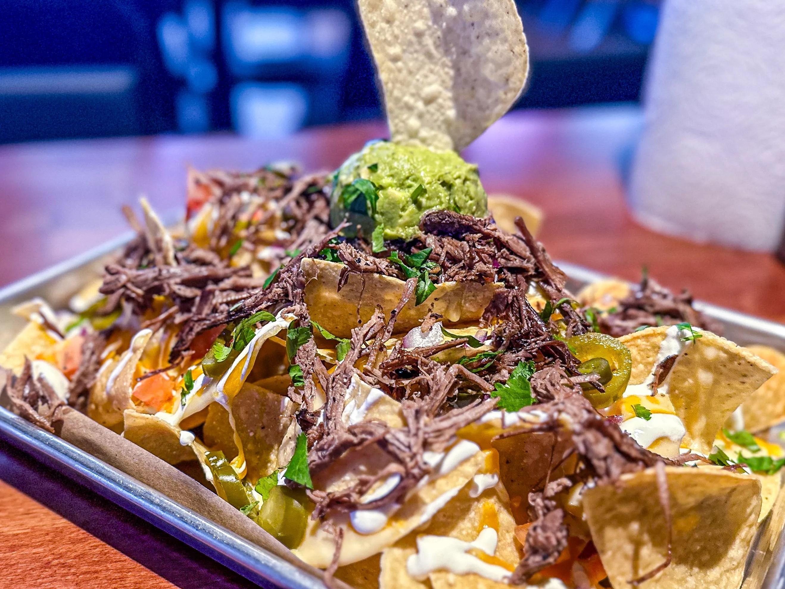 We opted for the brisket and traditional chips, which turned out to be pretty … pretty good. It was a very large serving: the menu does say “shareable,” we just missed it. The generous portion of moist and meaty shredded brisket was topped by a dollop of guacamole. We had to ask for a box when we left.