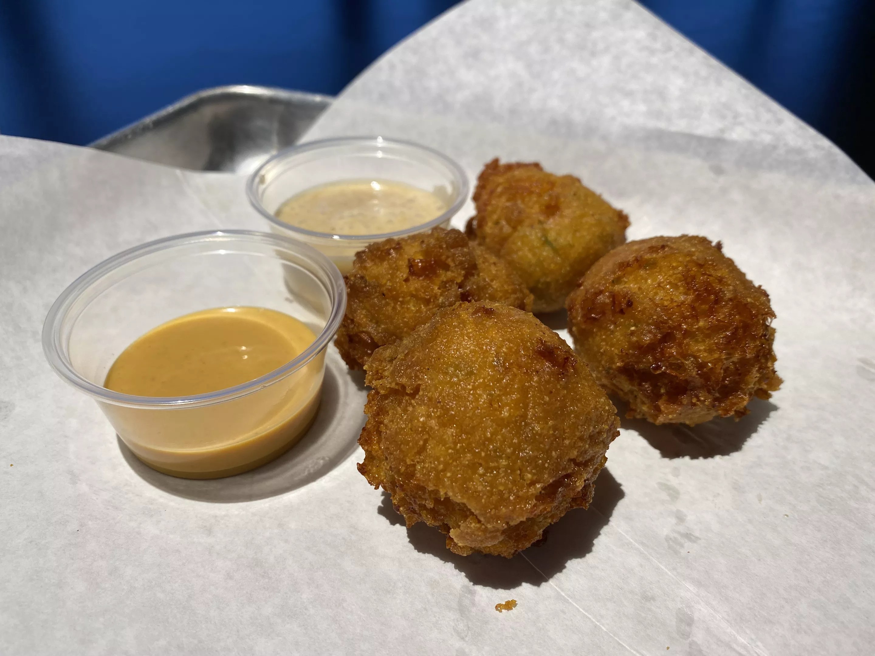 The jalapeno cheddar hush puppies are served with a cinnamon and brown sugar aioli.