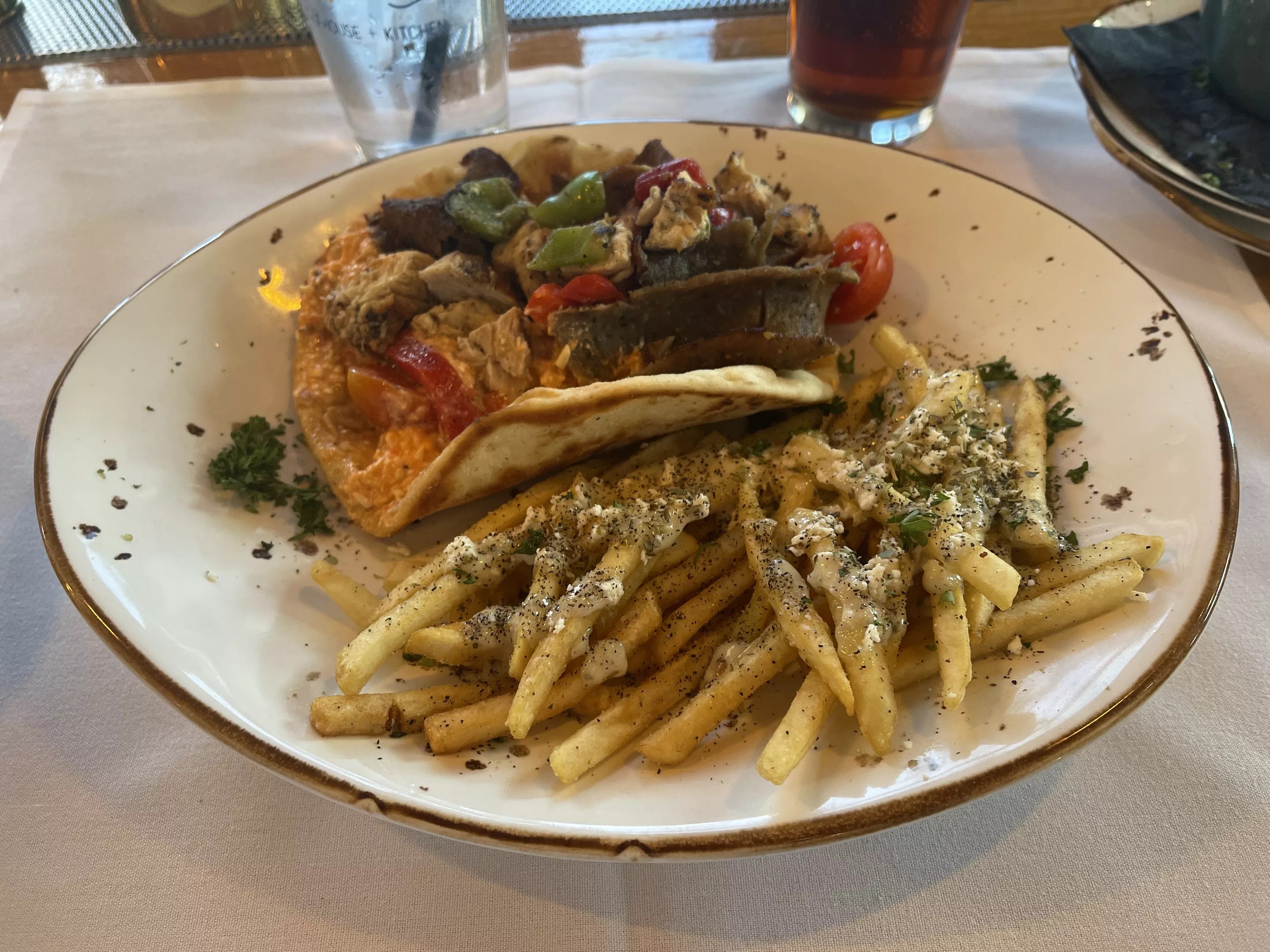 Many of the entrées come with the option of one or two side dishes. The green beans are simmered with stewed tomatoes and Greek spices and were a great option. But if you can only choose one side, do yourself a favor and order the feta fries. Thinly cut and fried golden brown, they are topped with a lemony sauce, crumbled feta and Greek seasoning and give a delightful twist to an otherwise boring potato. Stuff those feta fries directly into your original gyro pita and thank us later.