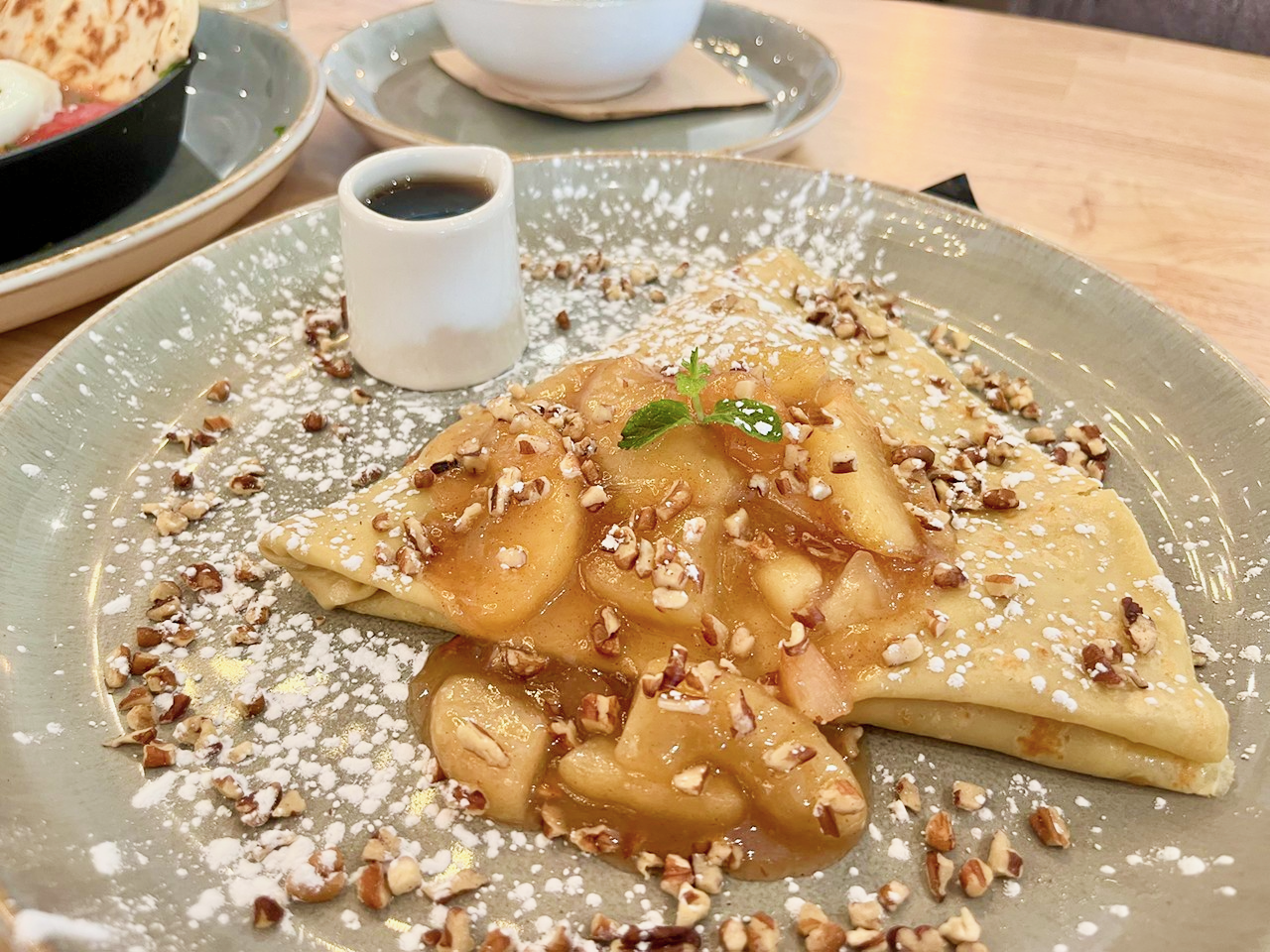 The variety of crepe, waffle and French toast options includes apple cinnamon crepe ($13). This customer favorite is filled and topped with an apple-cinnamon compote with roasted pecans and served with a small pitcher of warm syrup. Neither full stomachs nor the sugar rush was enough to stop us from digging straight in.