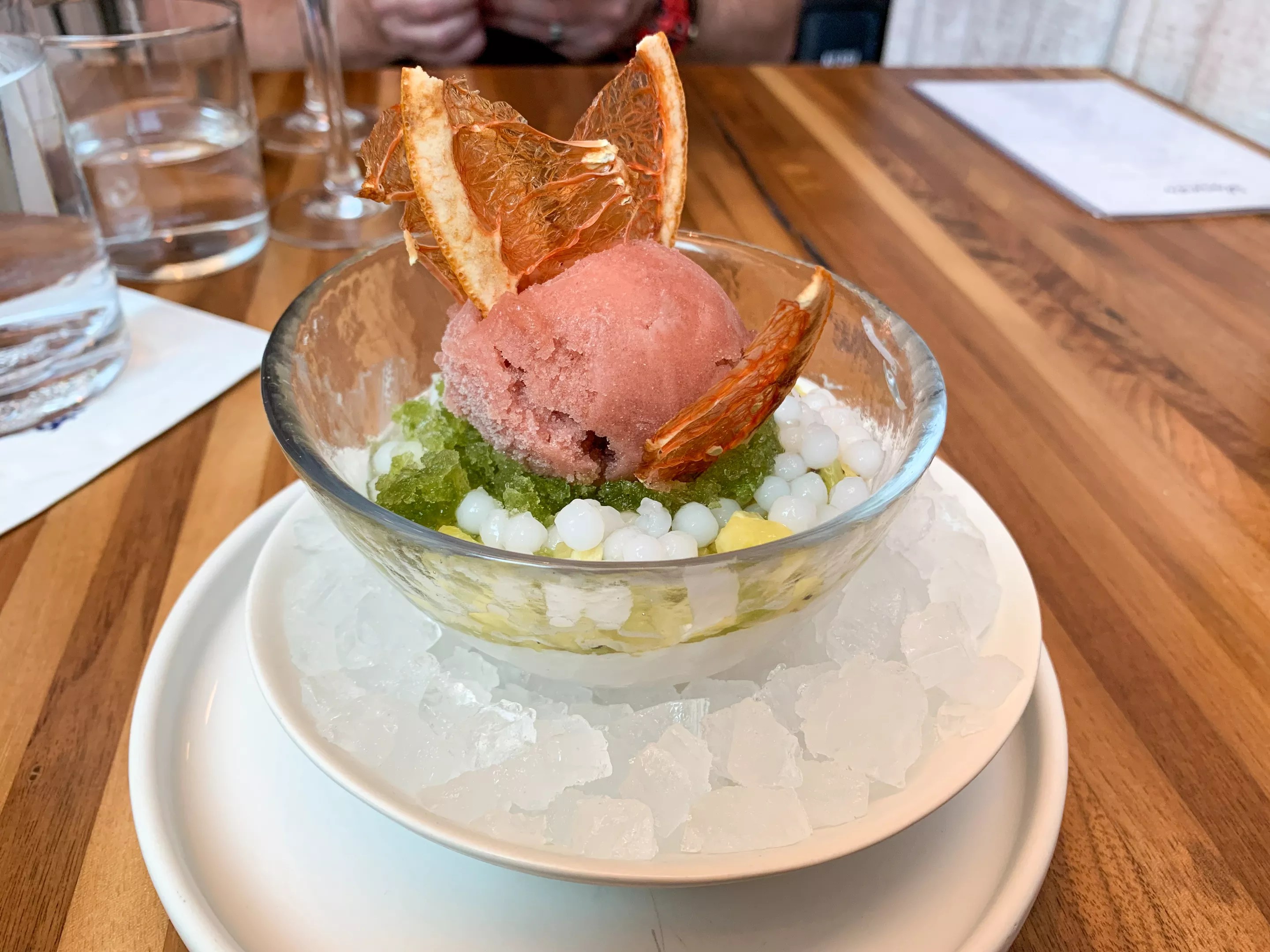 It was good, but atop were two icy and bland sorbets (strawberry and basil), diced out-of-season tropical fruits (kiwi and pineapple), paper-thin dehydrated grapefruit slices and waxy, flavorless tapioca pearls. The grapefruit was nice, but the rest didn’t do anything for the silky coconut panna cotta. It would have been better if they had focused more on the citrus aspects, or if they had gone with berries and stone fruits instead of the tropical route.