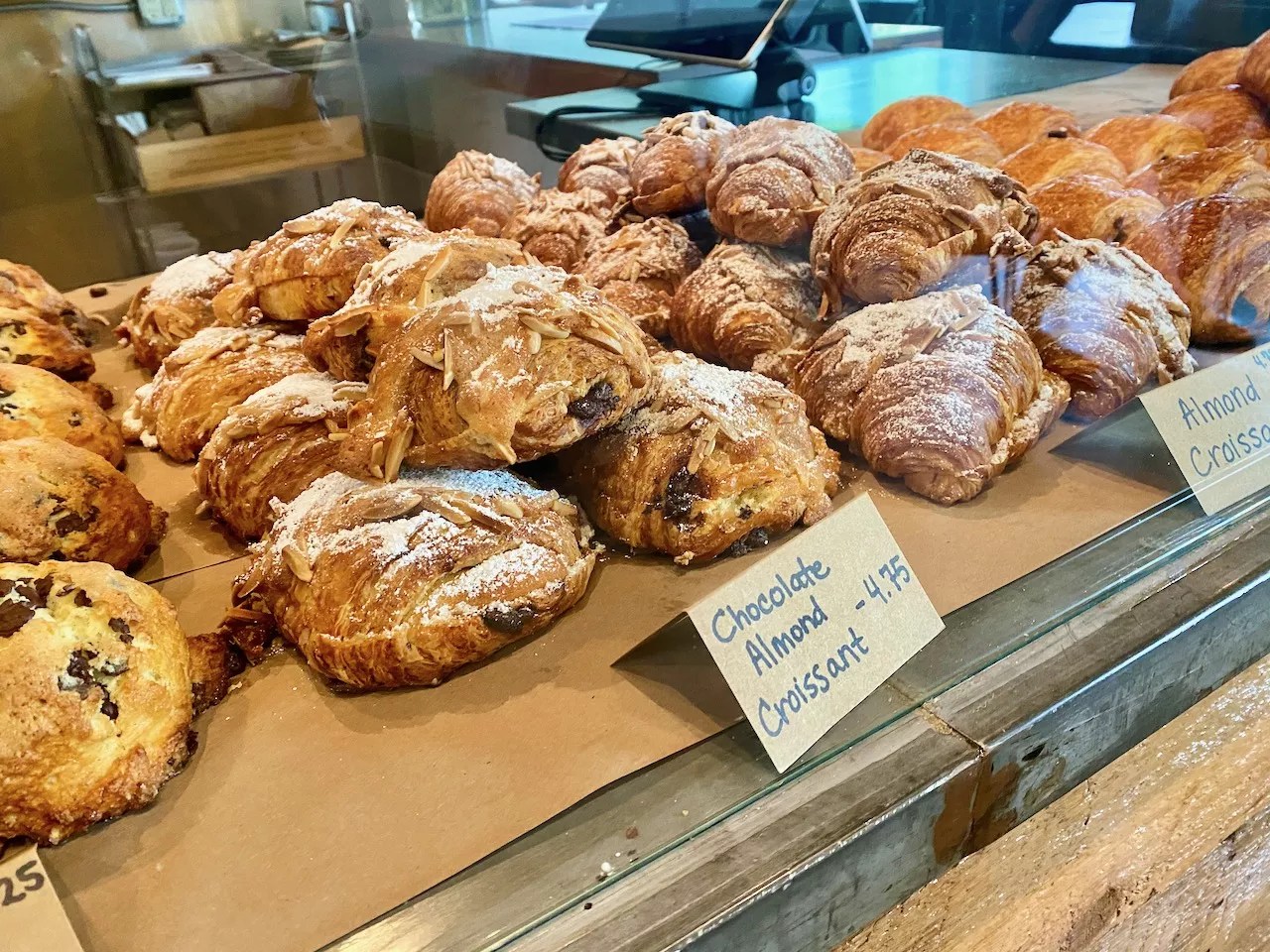 As for the food itself, all was great. A glazed cruller ($3) was not overly sweet and had a crisp exterior with a pore-riddled airy interior. A savory caramelized onion and white cheddar Danish ($4) was also spot-on and rich with flavor. The chocolate almond croissants ($4.75) are speckled with almond spears and powdered sugar that gather in lumps with pastry flakes on a plate below (or your lap).