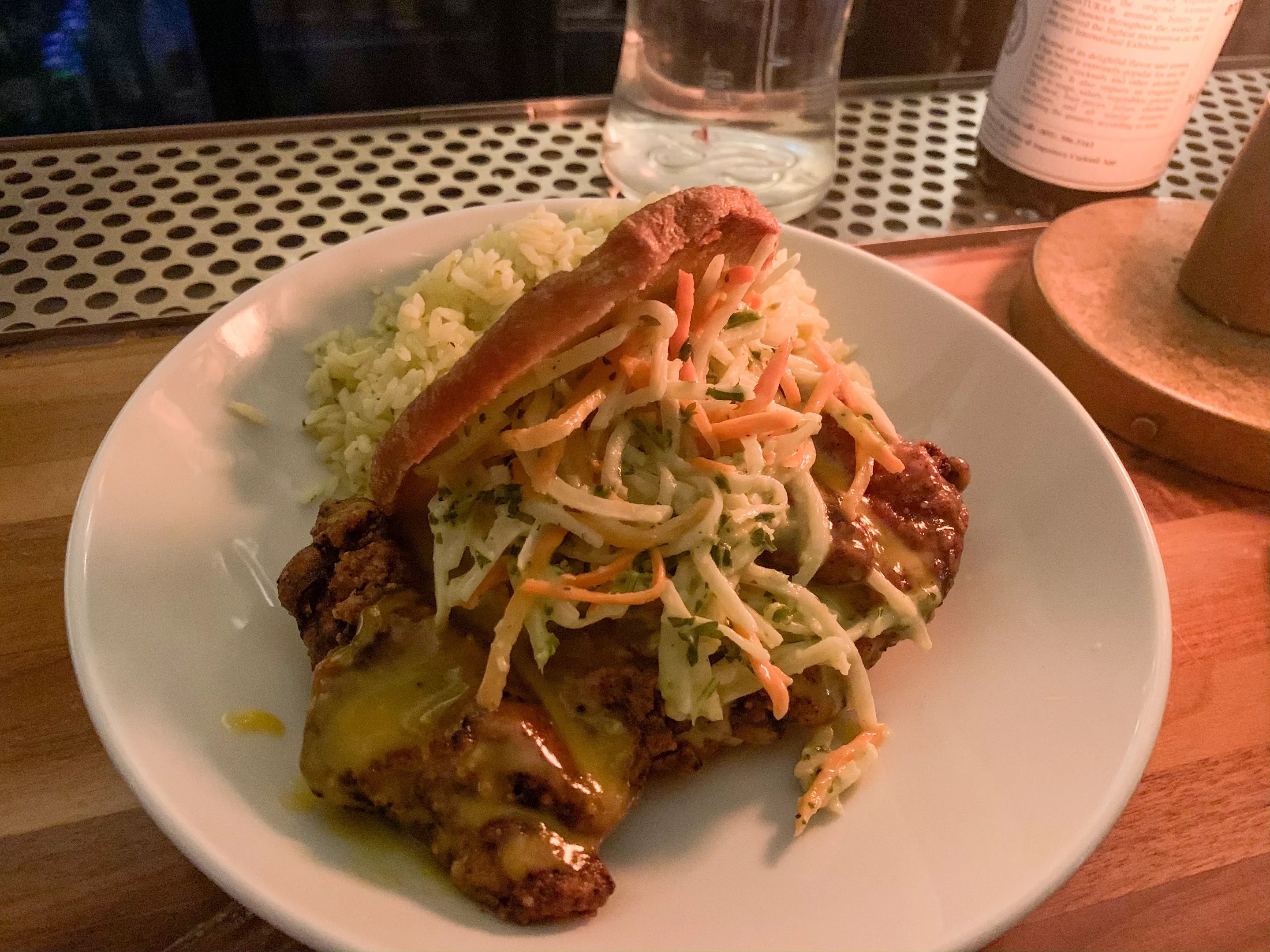 Yes, even this swanky cocktail bar we love has jumped on the train, and our party was split 50-50 on the execution. The chicken came out just-cooked (that’s to say, 45 seconds less and we’d be concerned) but with tender meat and a crisp exterior. Slathering that exterior was something like a honey mustard that leaned heavily into the honey. A slaw tops it, one that’s crisp but also a bit sweet. If you’re really into your honey mustard when you’re eating chicken, it’s pretty darn good. Good luck eating it, though; it’s a hell of a tough time in that crisp arepa setting. But the whole thing gives us hope that some fun creations could be to come in this weekly special.