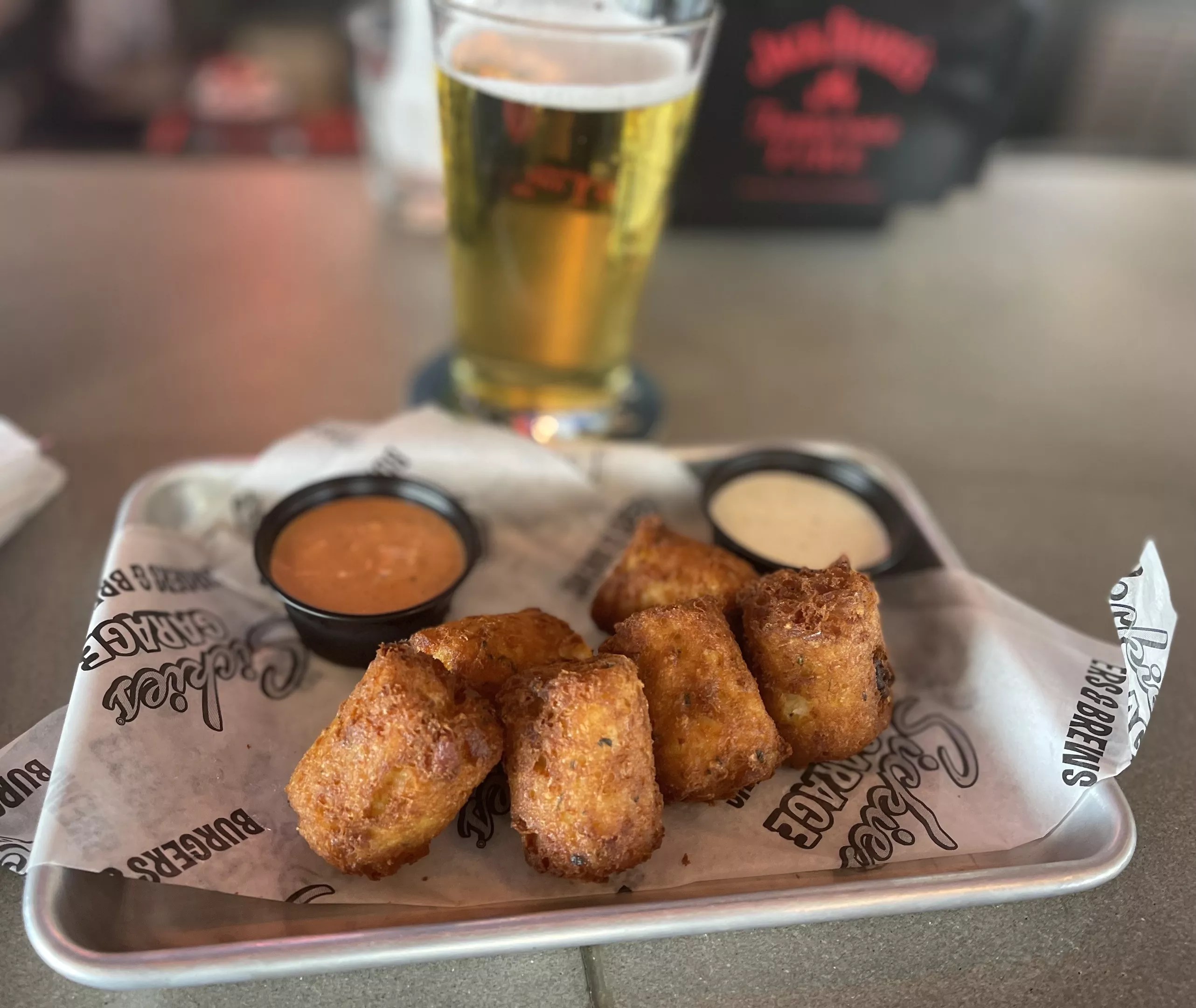 The menu is extensive. Besides the lineup of 50 burgers, the menu offers wings, mashed potato bowls, mac and cheese bowls, sandwiches, salads, baskets and shakes (including adult shakes). We started with the Tater Kegs ($10.99), which are oversized tater tots with bacon, cheddar and chives. They’re usually served with a ranch dip, but we decided to add a side of OH YEAH sauce, a flavor-packed dip made of mayo, mustard, ketchup, pickles and ghost peppers. If you like a kick in your dips, the OH YEAH sauce has a great flavor profile and heat level, but not so much that you need to sign a waiver or order a glass of cold milk. There were six tots to the order, fried to a golden brown crispy perfection. Biting into them, you could taste the chunks of real bacon.