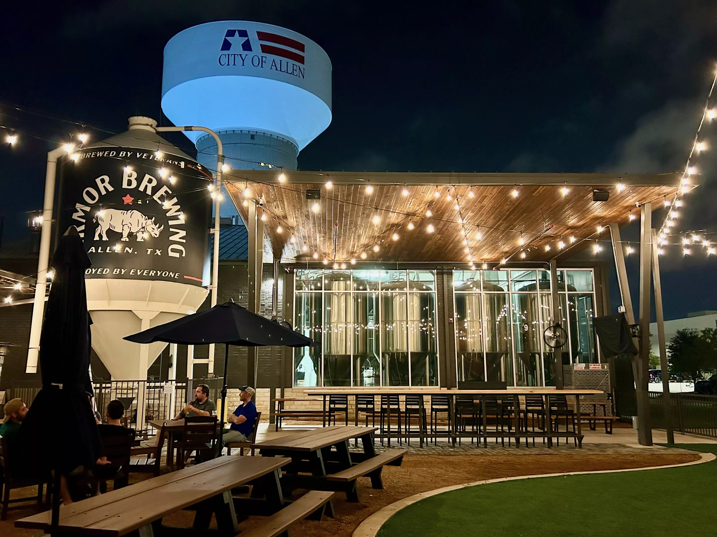 Large brew tanks can be seen through big windows, and a City of Allen water tower looms in the background. A nice patio is strung with lights, and there are plenty of televisions to watch sports, plus a stage for live music. Games are scattered around a grassy area near the patio. The interior is spacious with high ceilings and a giant, rustic chandelier over the bar.