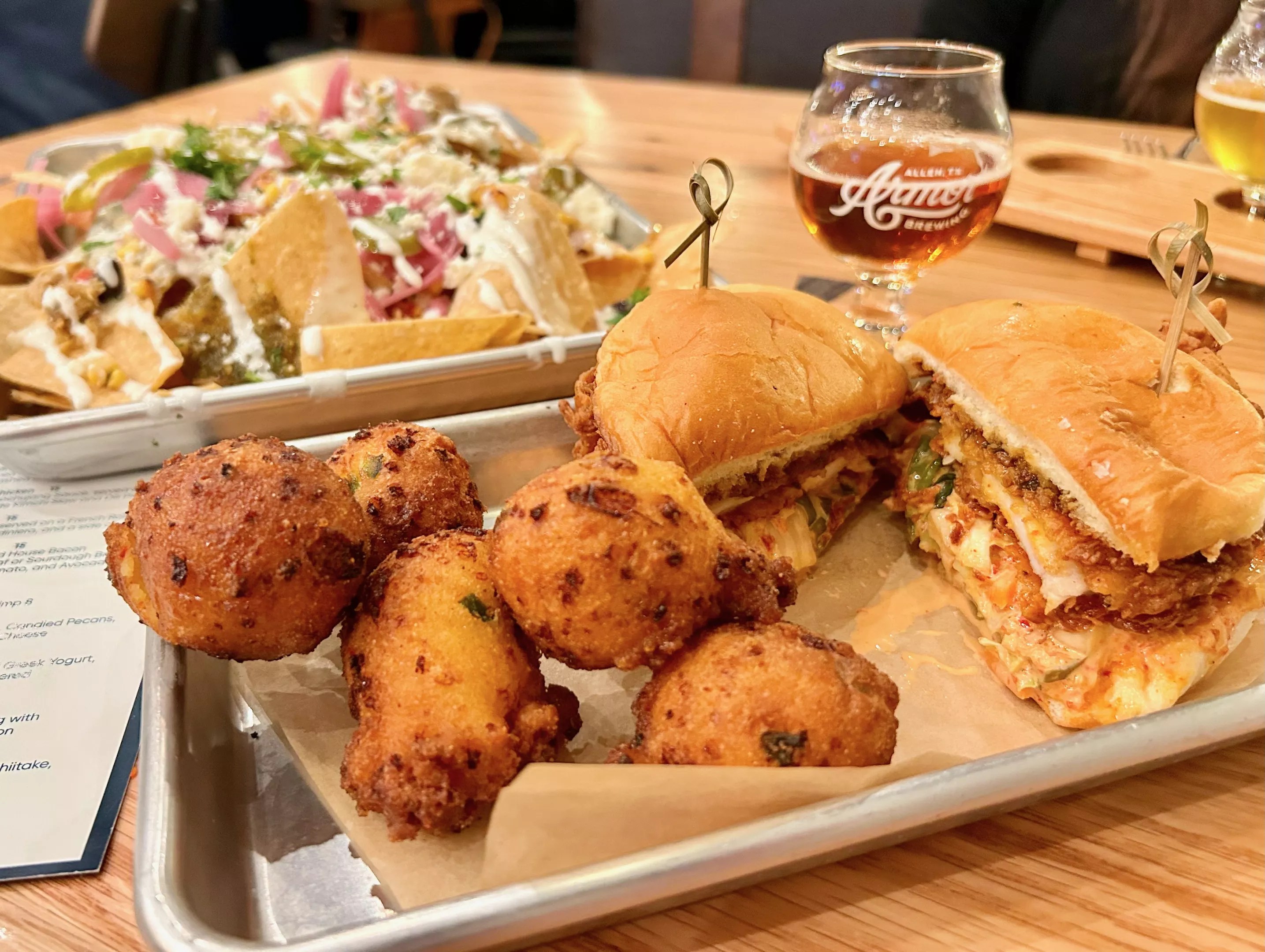 Next up was the Korean-Fried Chicken sandwich with a spicy Gochujang crunchy kimchi slaw. All of it was held together perfectly with a King’s Hawaiian bun. Order extra napkins and dive in on this one. We opted to upgrade the fries to cheddar jalapeno hushpuppies, which turned out to be a delicious decision.