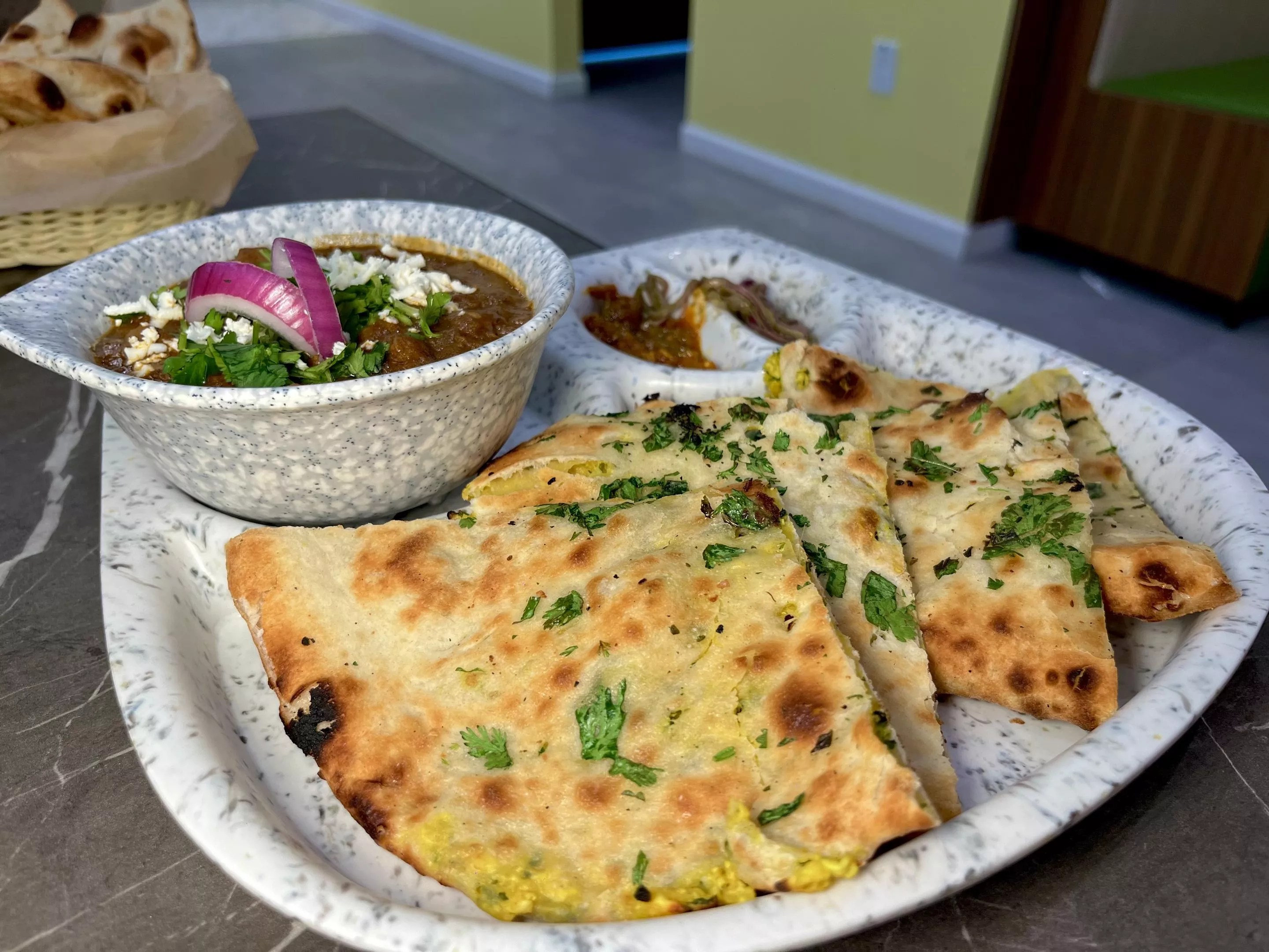 The South Indian section of the menu also presents worthy contenders, including the butter garlic dosa, a thin lentil crepe brushed in butter-garlic chutney, or the uttapam, a popular Indian pancake dotted with onion and shredded carrot. We’re told that Gwalia’s most popular specialty is the Amritsari Kulcha Chole, sourced from the North Indian region of Punjab. The dish boasts a fluffy piece of bread stuffed with potatoes and cheese: the perfect complement to a bowl of spicy chickpea curry that’s served on the side.