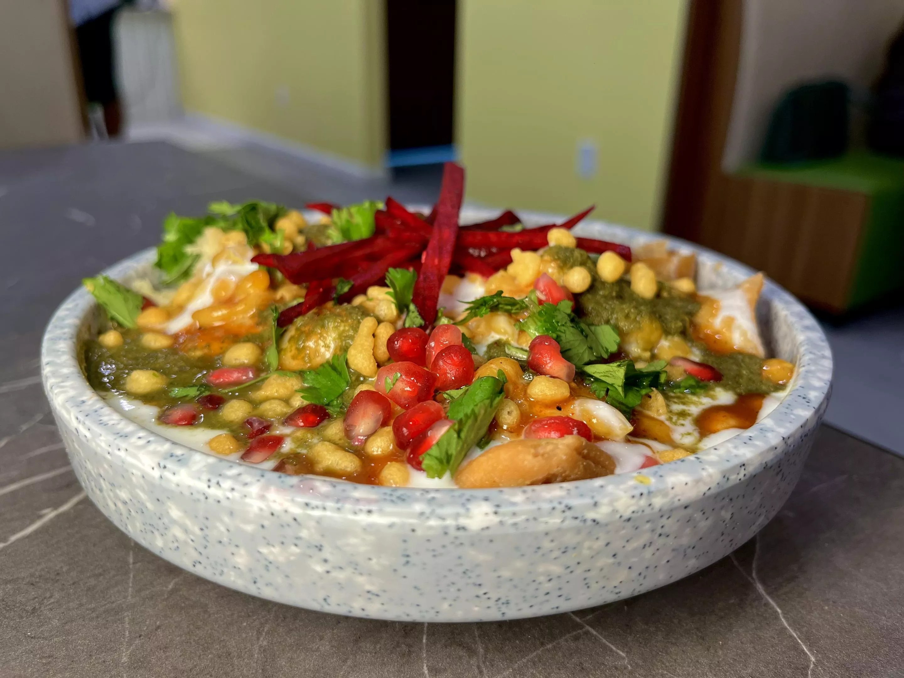 Try one of the North Indian chaats, finished with a colorful display of toppings.