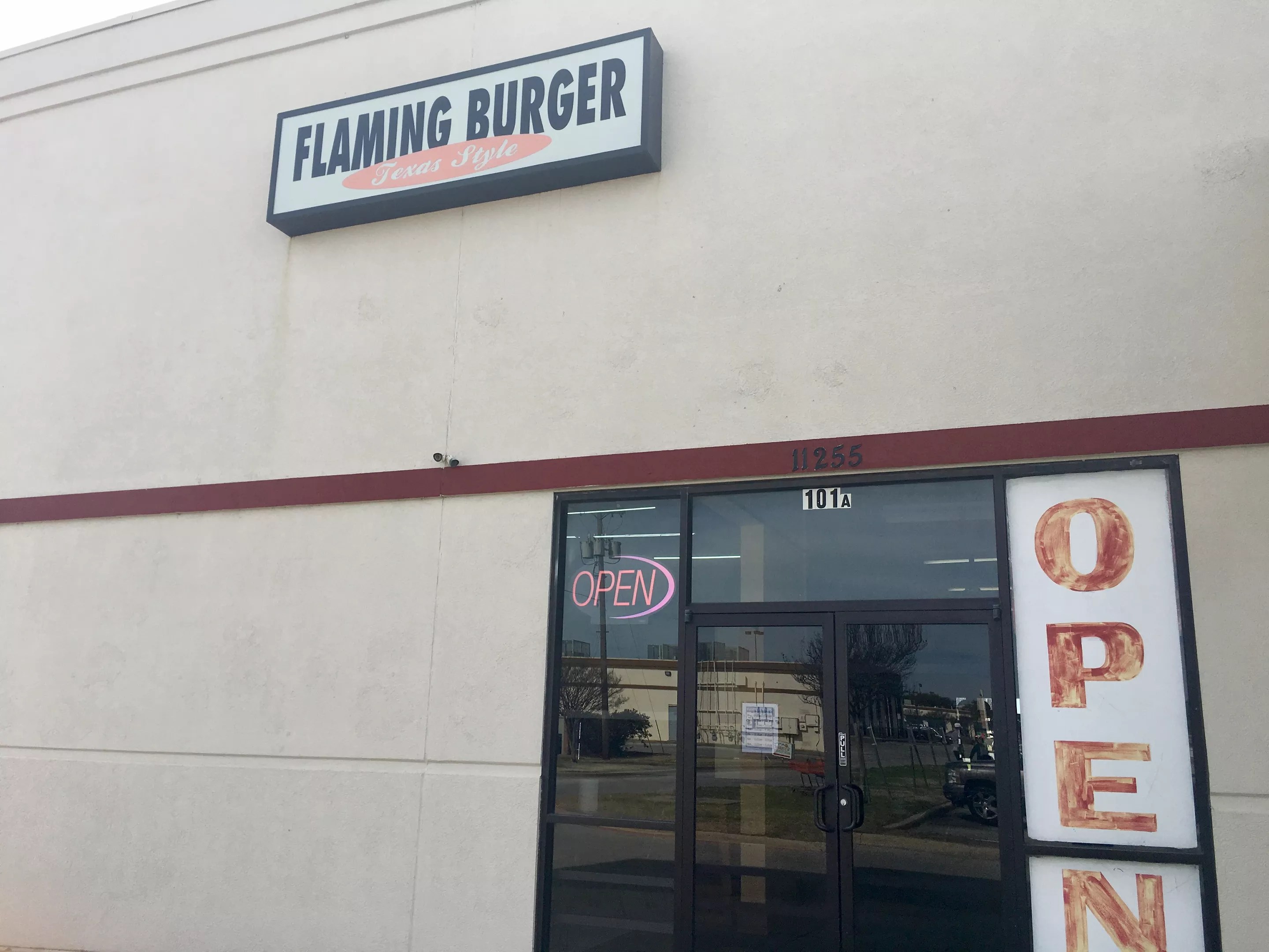 Flaming Burger is in a Lochwood Strip mall, next to a Home Depot lot.