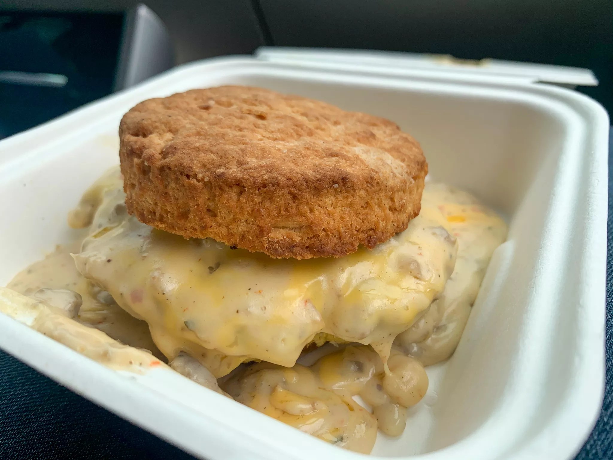 In the Before Times, you could sit at the high-top counter and order the Ol’ Dirty biscuit sandwich, which would easily make you look around to make sure no one was watching you tackle the thing. A biscuit and gravy isn’t meant to be handheld, even if it’s in sandwich form.