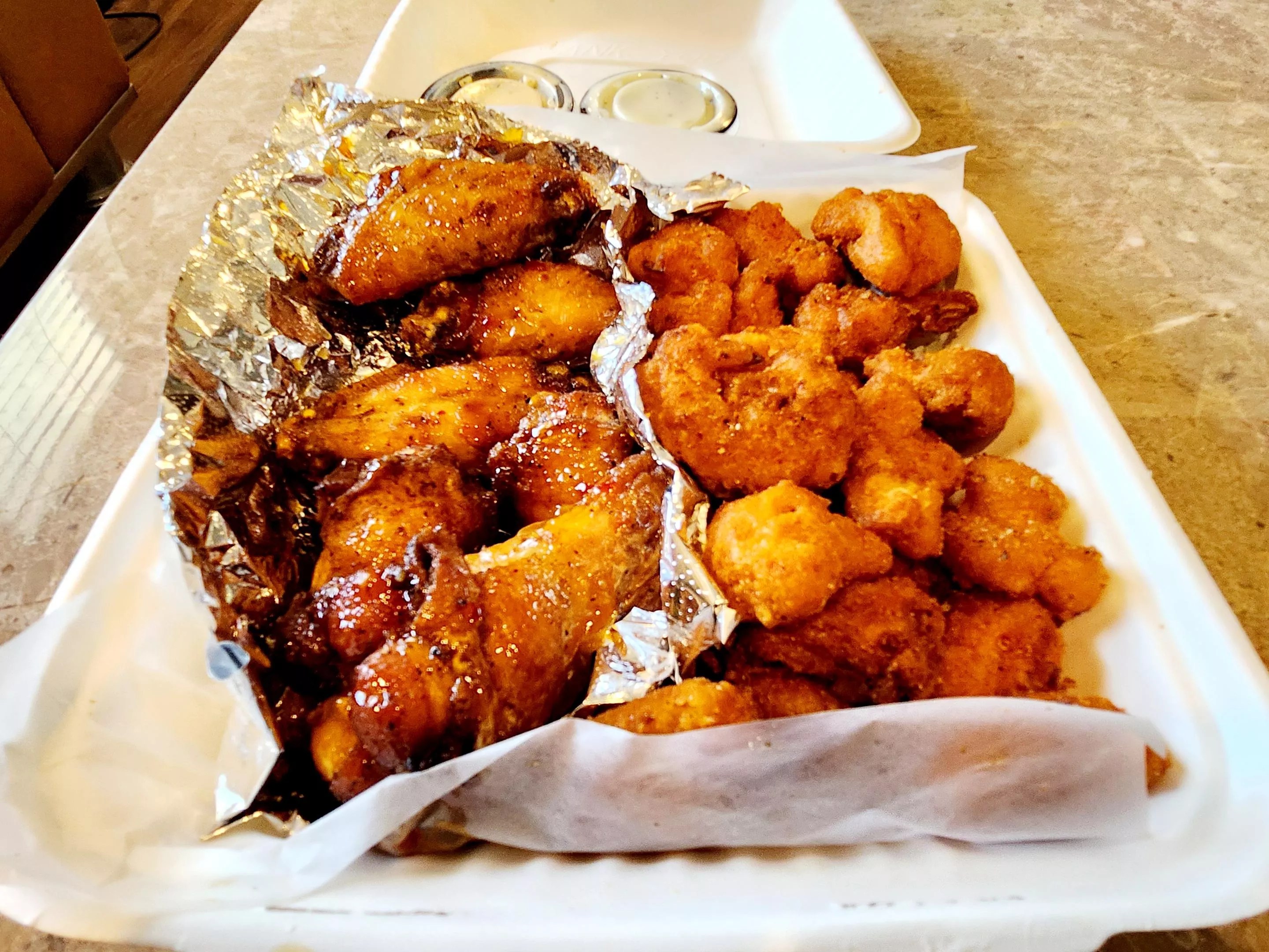 Cajun sweet and spicy wings with a side of awesome fried cauliflower bites.