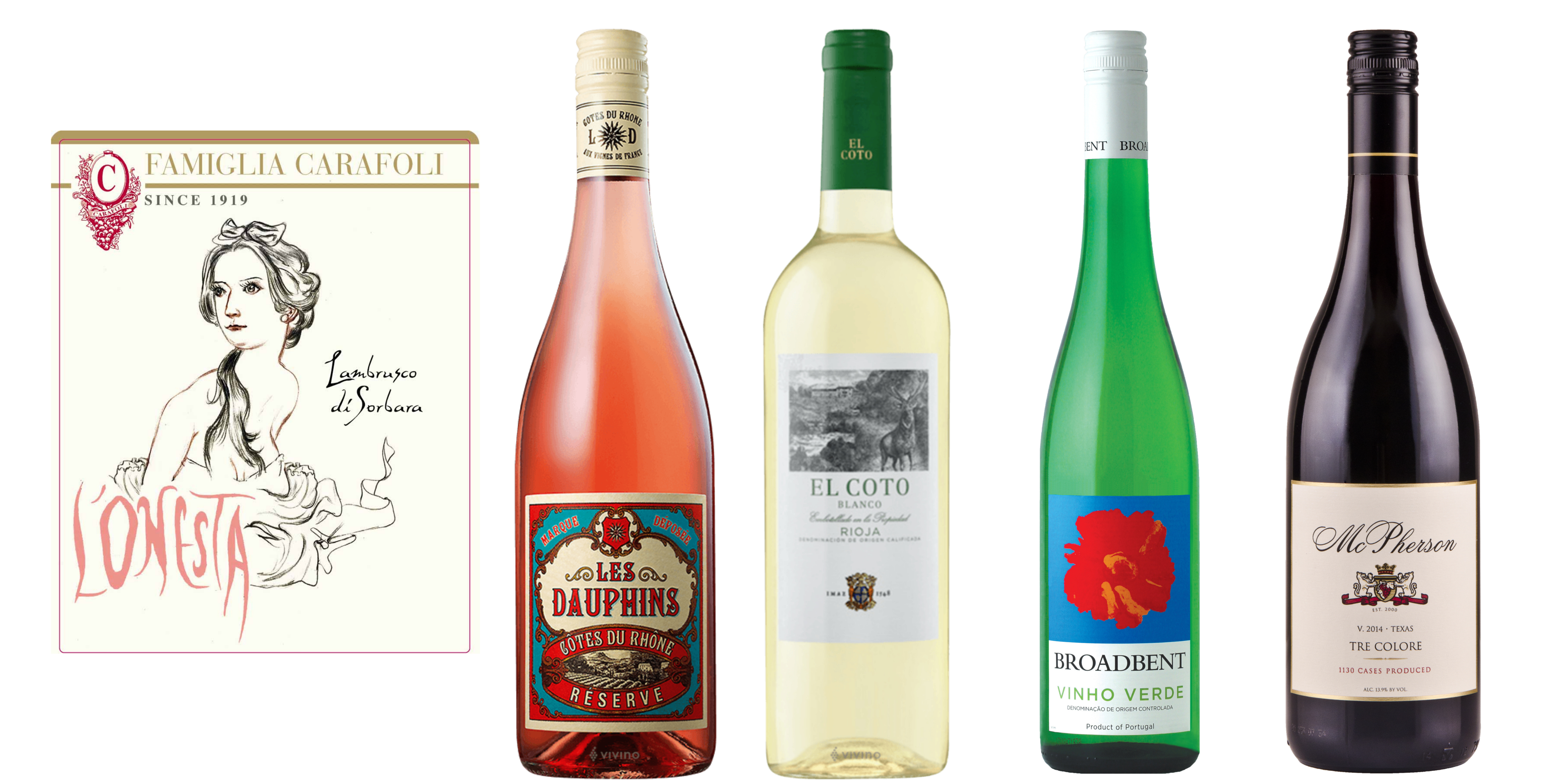 Starting on left: 1) Cantina di Sorbara L’Onesta, 2) Cellier des Dauphins Les Dauphins Reserve Rosé, 3) El Coto Blanco, 4) Broadbent Vinho Verde, 5) McPherson Cellars Tre Colore