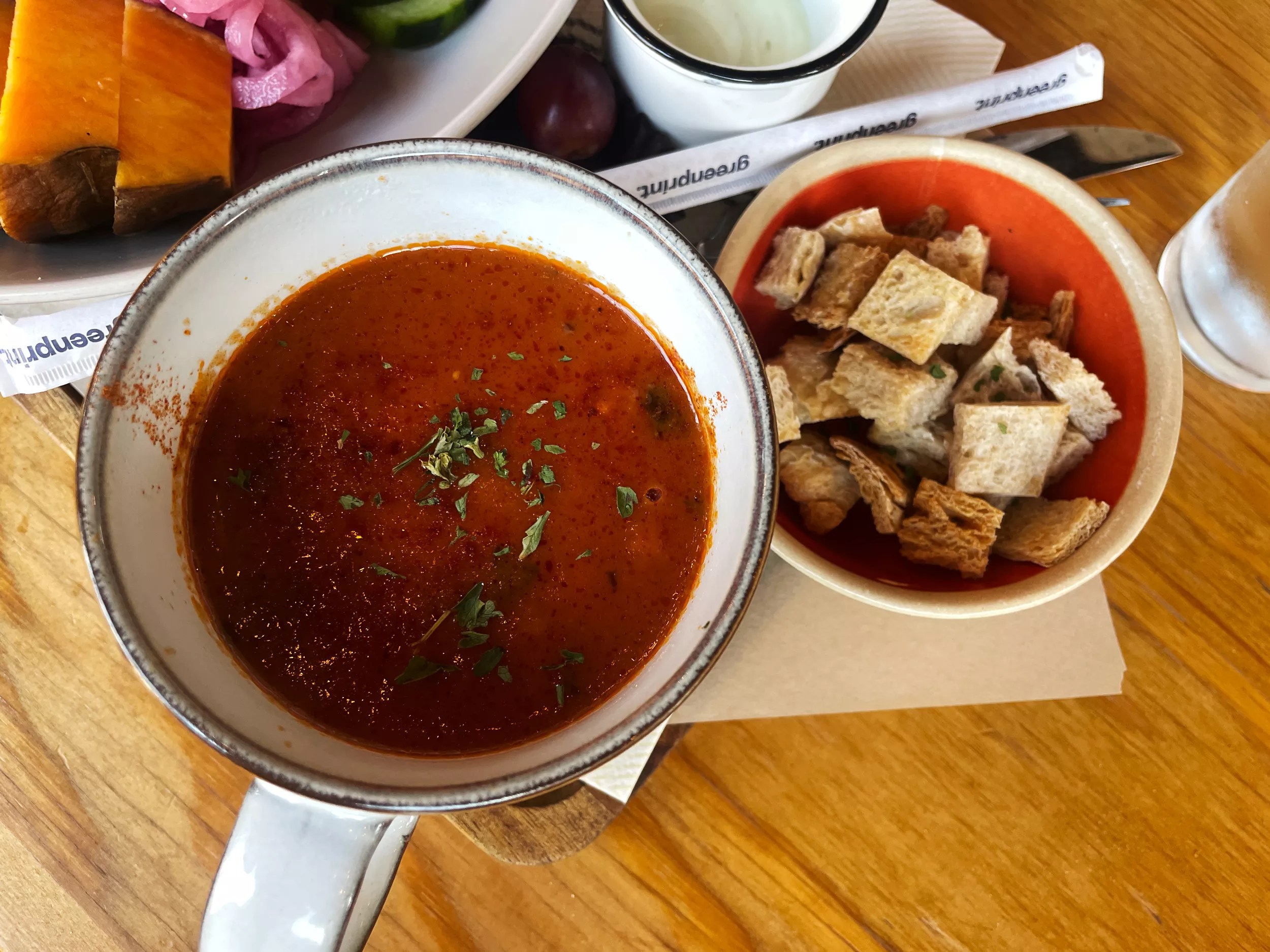 currants, rose hips, blueberries, strawberry pieces and cornflower blossoms. With that, we went cozy with a bowl of rustic tomato soup and healthy with the Mediterranean bliss bowl.