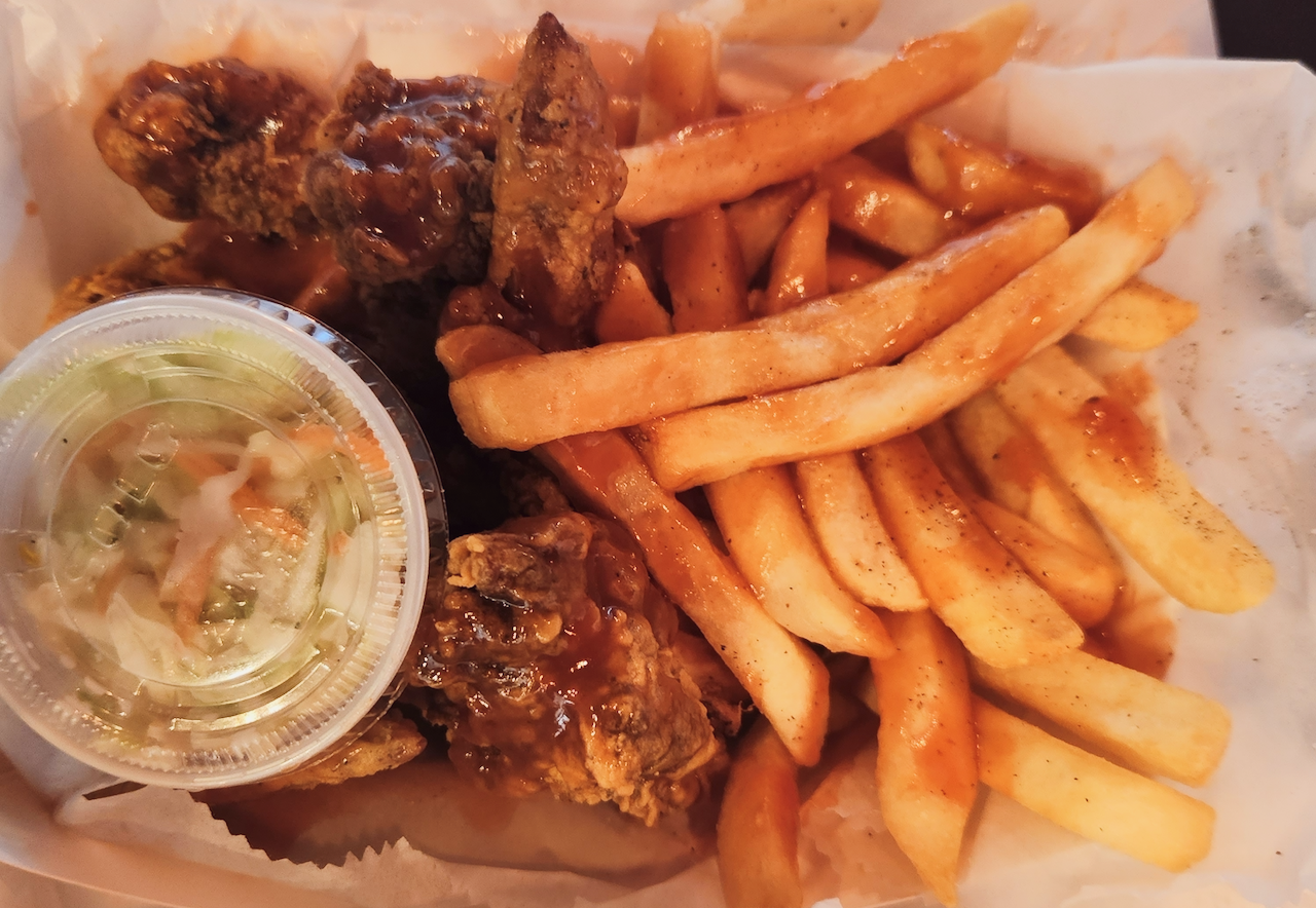 A six-piece wing basket “fried hard,” which, according to some online research, is the best way to order, comes covered in mild sauce, known as “Chicago-style,” with seasoned fries, coleslaw and pickles shielded by two slices of bread.
