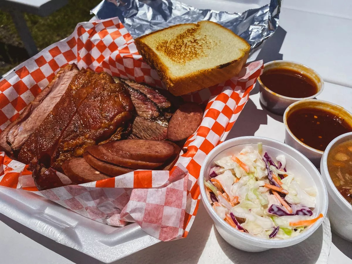 The Texas Trinity of barbecue (brisket, ribs and sausage) courtesy of Harris Bar-B-Que.