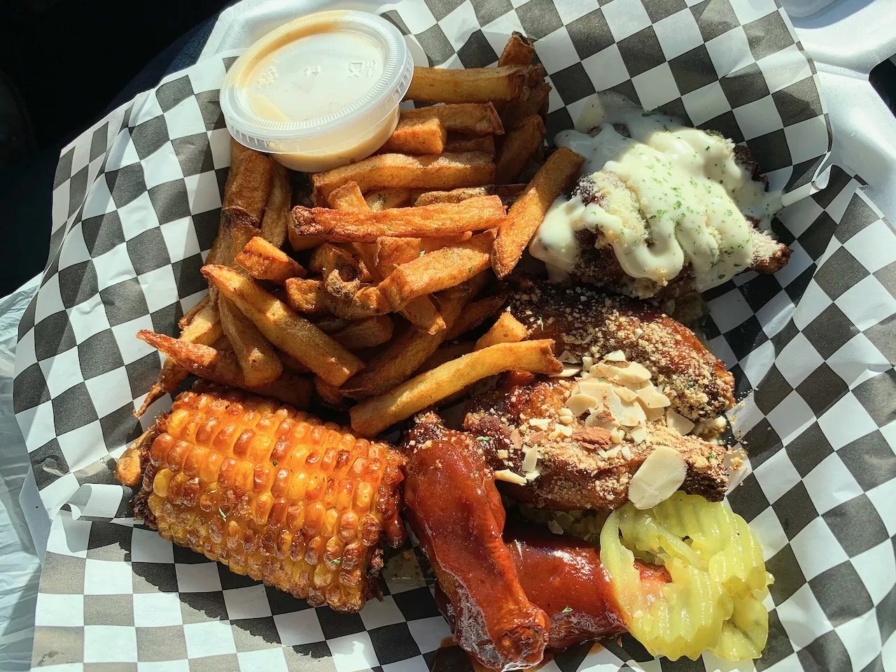 Before heading over, it’s highly recommended you order online or get there a couple of hours before closing. They’re open Wednesday through Sunday from noon to 7 p.m. There are several covered picnic tables for dining there.
