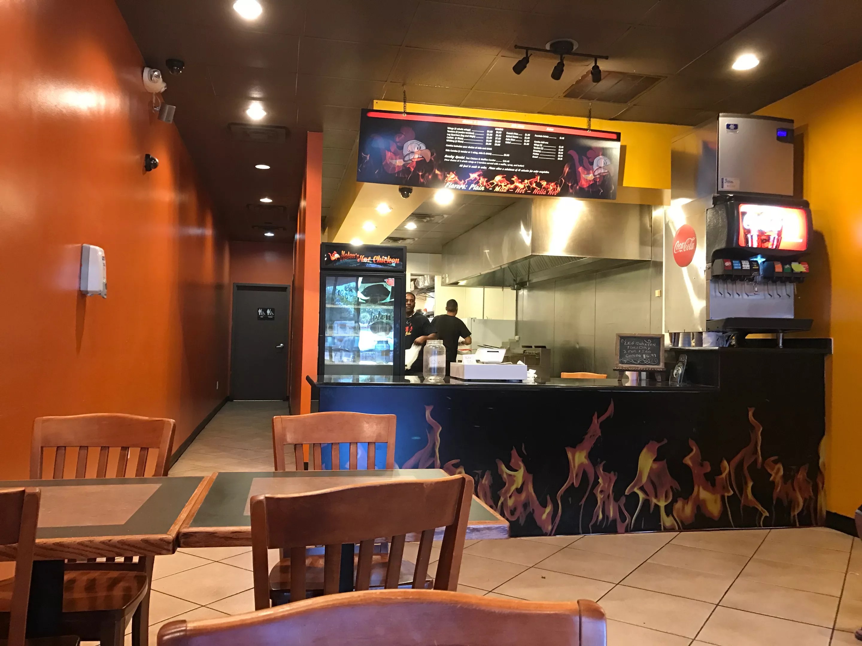 The basics are covered on the menu that hangs over the counter. Chicken can be ordered as a leg quarter ($5.99), three tenders ($6.49) or three wings ($6.99). Two bucks more adds a side and a fountain drink to the order, and the need for a drink will become readily apparent later. Catfish and whiting fillets round out the proteins, and it’s time to bring the heat.