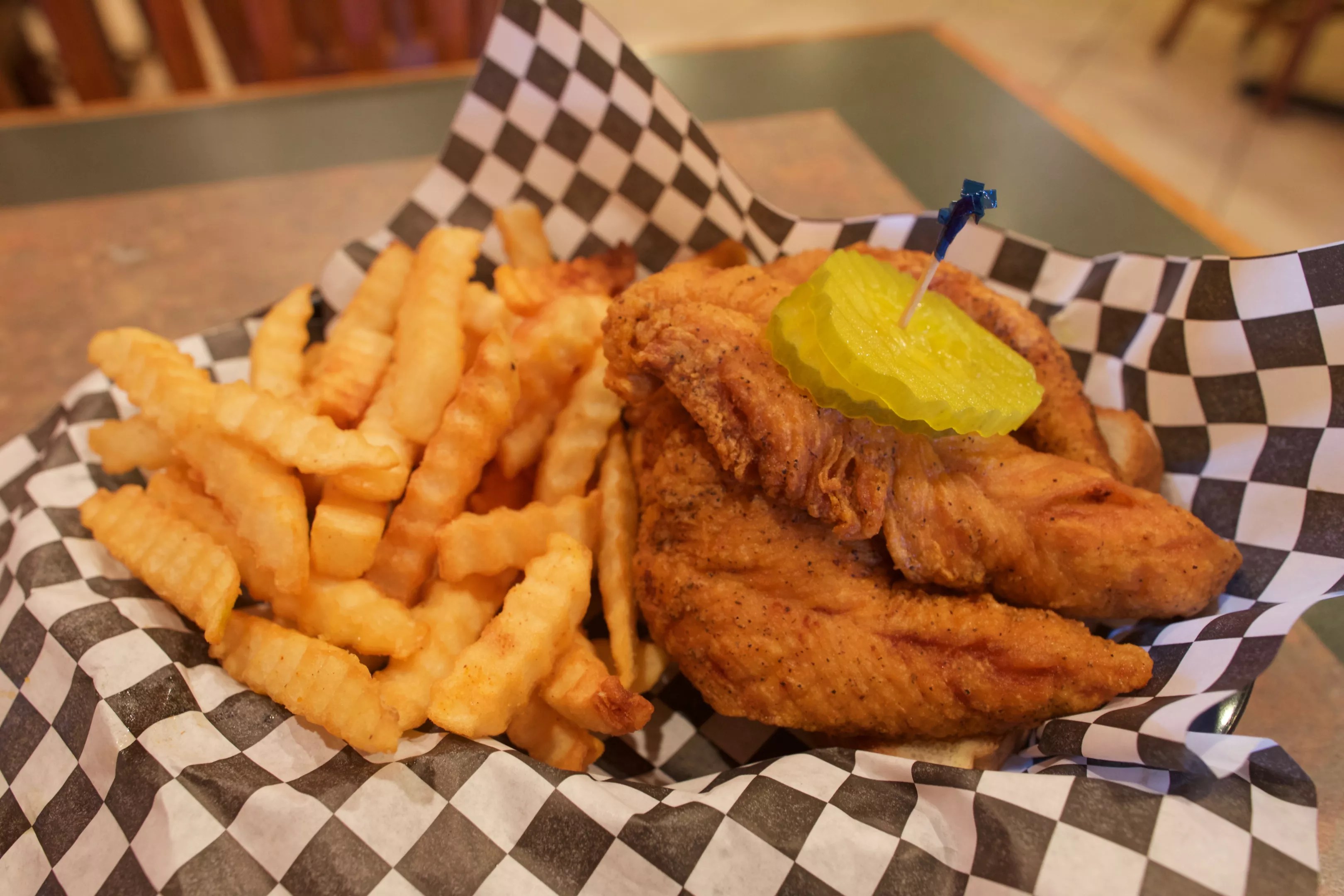 He’s not kidding about the heat. Our tenders arrived, and the cayenne heat is definitely strong at the hot level; in no time, my eyes are watering and my nose is running. But the crispy and spicy batter wraps around supremely moist, flavorful chicken breast meat. The combo nails the Nashville marks to a tee, down to the slice of white bread nestled under the chicken tenders and the dill pickle slices on top, just like they serve in Music City.