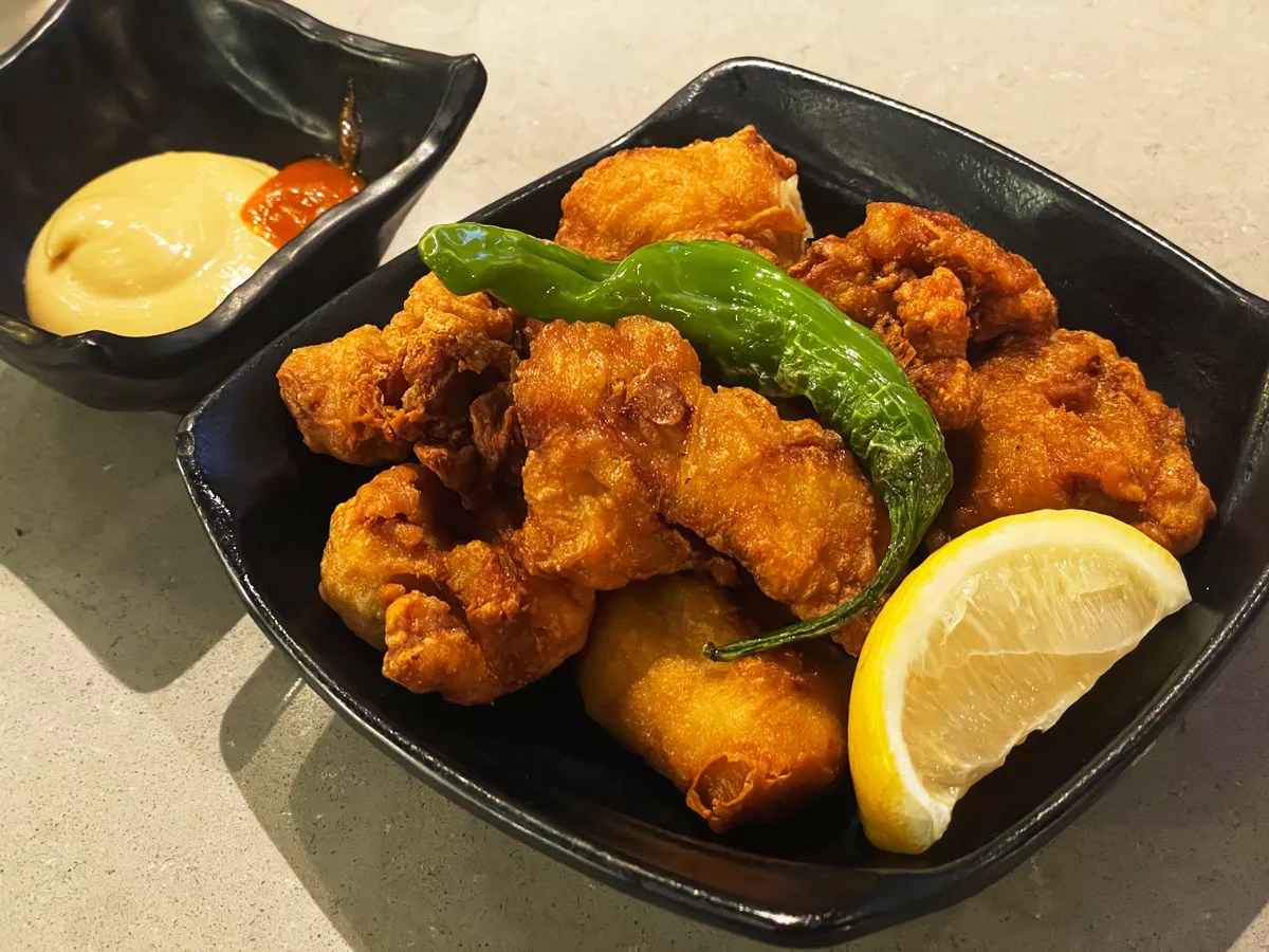 Chicken karaage is Japanese fried chicken, and it’s just as popular abroad as it is in the States. The recipe is really basic: marinate chicken and deep fry it. Simple, but so flavorful. The karaage here is served with savory miso mayo, a lemon wedge and shishito pepper.