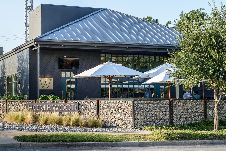 There is only one way in which Homewood’s design is inhospitable: its hostility to pedestrians. Although the battle-ship gray restaurant is on a major street corner, it has no walking entrance at all; the only door is through the parking lot. A potential sidewalk connection is, instead, a dead end. The patio is walled off by rocks piled into metal frames.