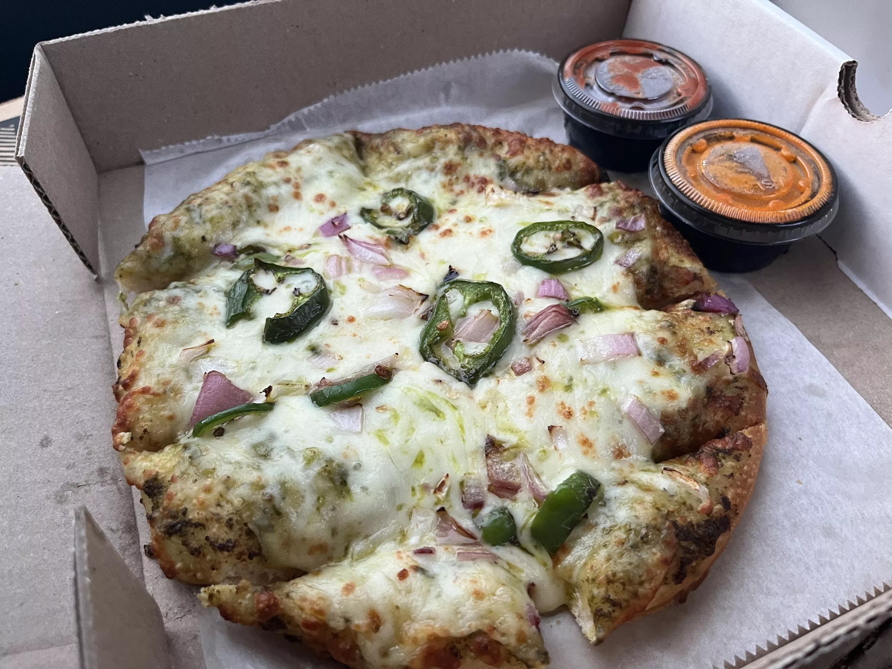The chicken tikka pizza is another hard-to-miss specialty here that comes with a spicy tikka-based red sauce and buttered protein – either chicken or paneer. It’s topped with green pepper, melted cheese and green onion for some extra flavor. For butter chicken in pizza form, it certainly wasn’t bad.