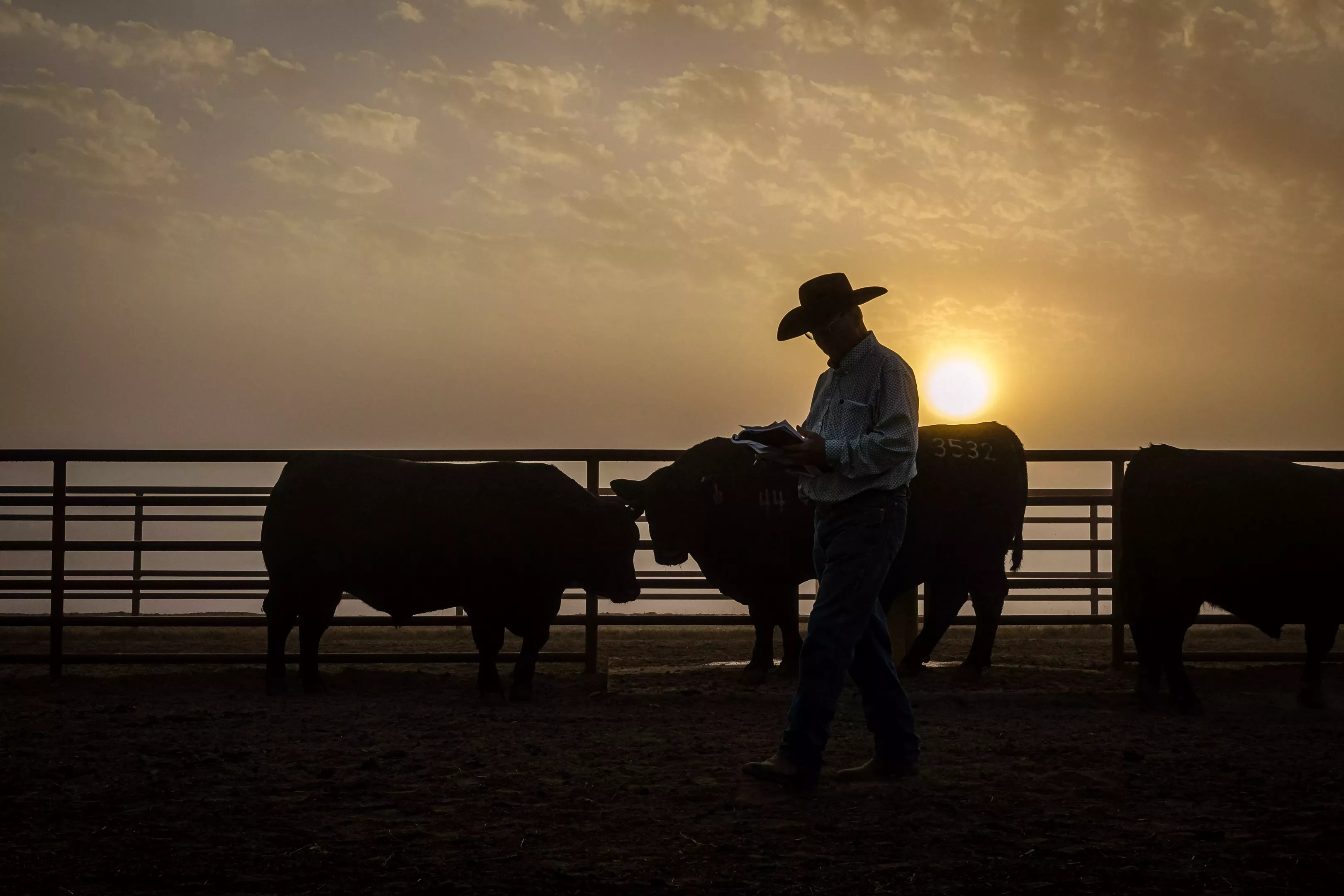 According to Payne, the bulls for sale this day are all less than two years old. Copies of a 300-page catalog are on every table in the main building, detailing traits like temperament, carcass marbling and lineage of each bull for sale. As the auction nears, every rancher has either the catalog or a cheat sheet in front of them. Attendees fill up on breakfast tacos stuffed with brisket and eggs, plus plenty of coffee, before heading next door to the auction barn.