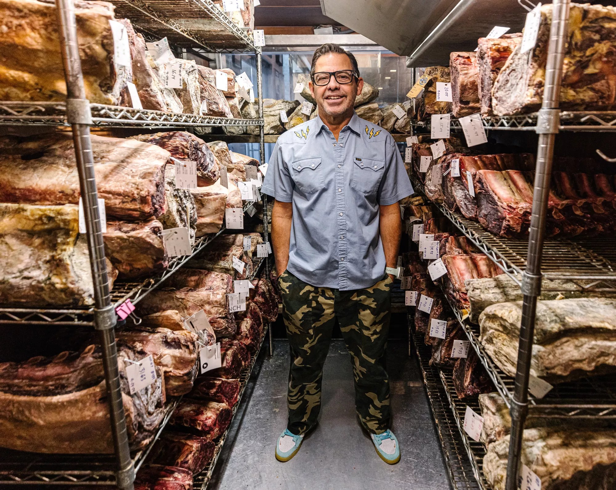 Knife owner John Tesar stands in his meat locker filled with 44 Farms beef.