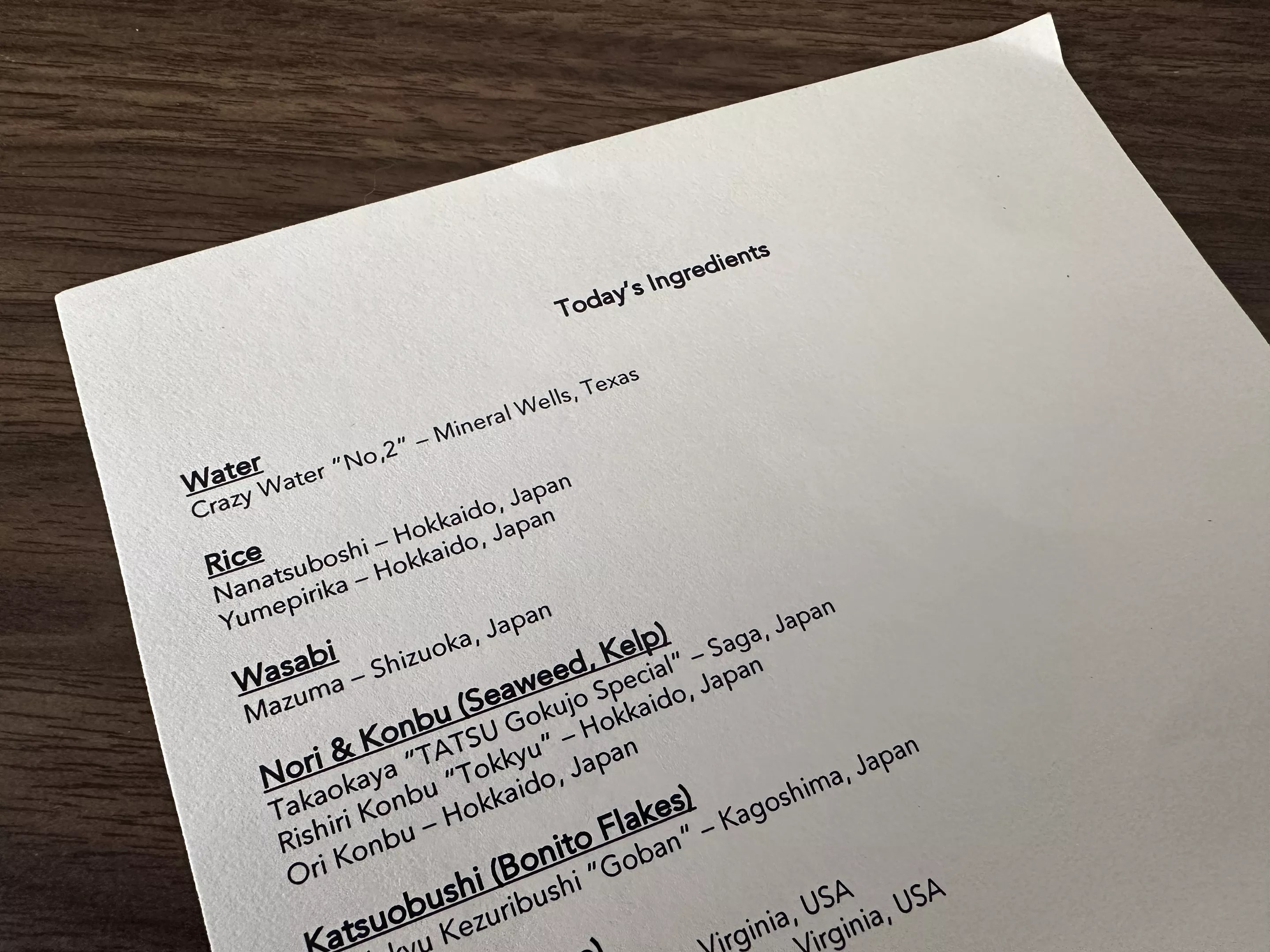 He not only listed water, but listed it first. When asked, Chef Tatsuya told us water is the single most important ingredient in making sushi rice, and since that rice was such an important component of all the sushi, it tops the list.