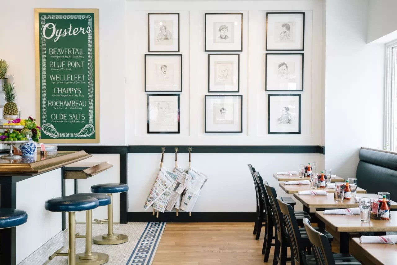 The oyster and cocktail bar (left) runs the entire length of the open, airy dining room.