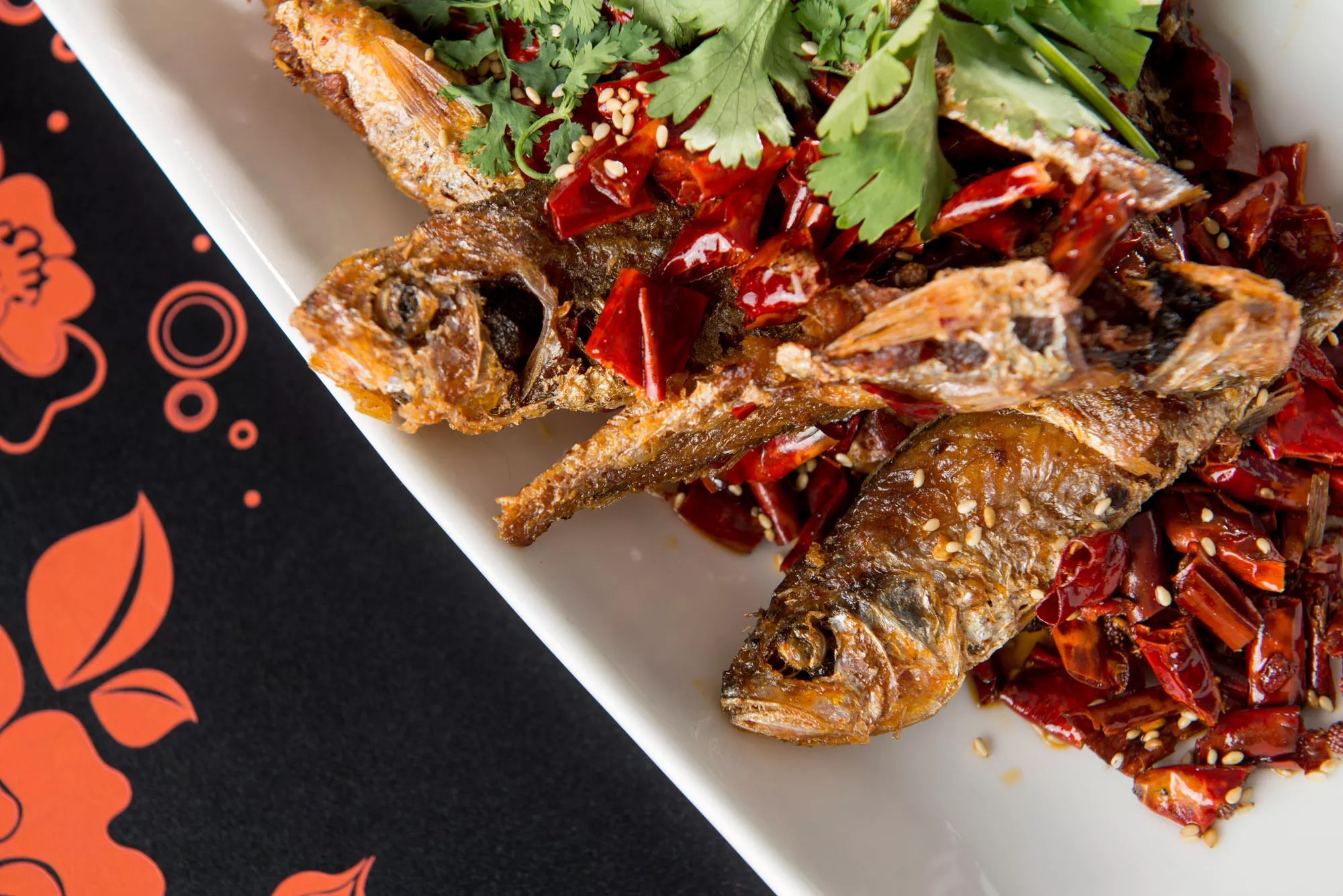 Fried whole yellow croaker fish are a delight ($14). The croaker is not quite six inches long, and just over an inch tall; most of the bones in its body, after cooking, are perfectly, crunchily edible. Hunan Bistro fries the fish, without batter, and then buries them under a mountain of sauteed yellow onion, green onion and cut red chile peppers. Tongue-tingling Sichuan peppercorns are here in abundance, too.