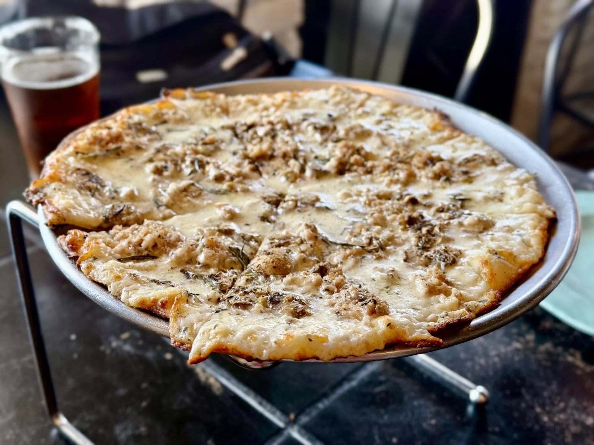Next up was The Alamo ($13.50, 10-inch), an aptly named pie dripping in South Texas flair: chorizo, jalapeno, cilantro, Mexican crema, mozzarella and roasted poblano bechamel. This one has a kick of heat, although it’s not five-alarm level, it is noticeable. And Mexican crema and roasted poblano bechamel on pizza? We’re here for it.