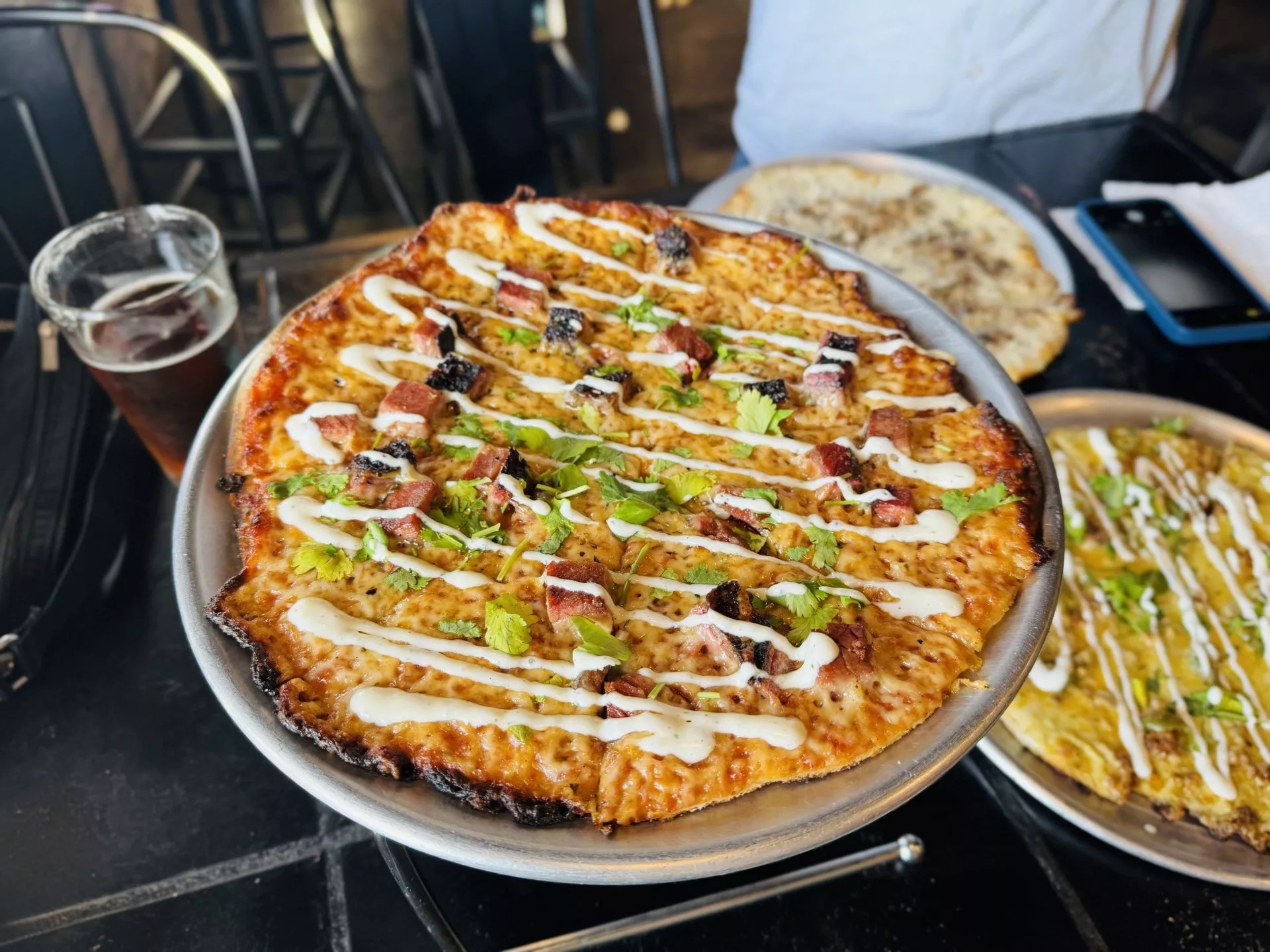 The focus here is simple: creative craft pies and local-only brews. You can customize your own or choose from a dozen signature pizzas, not counting the limited-time or “secret” menu options. And they come in just two sizes: 10-inch personal-size or 14-inch large.