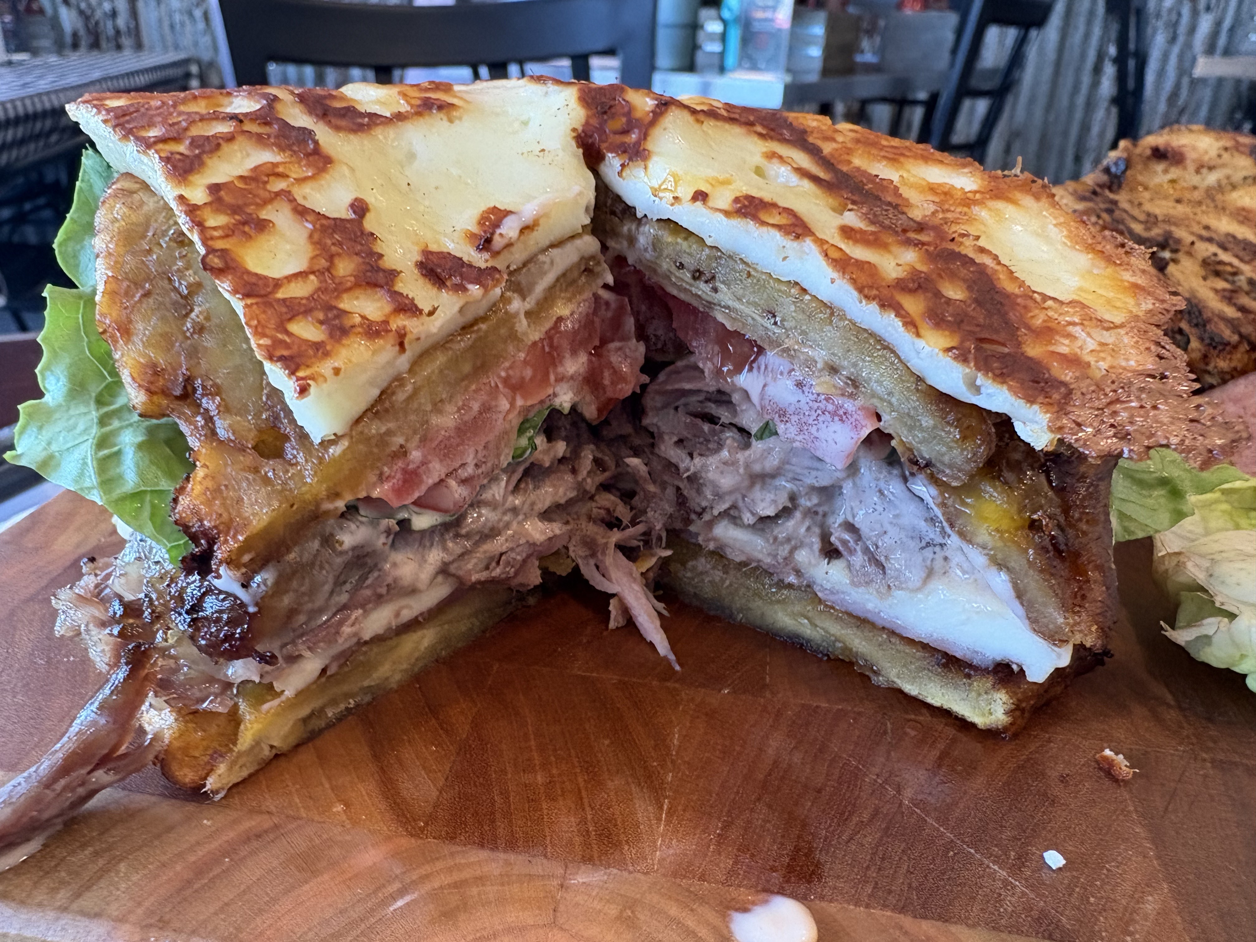 Next up was the behemoth patacon sandwich, with meat between double-fried plantain patties, fried cheese, lettuce, tomatoes, crema, and a mixture of ketchup and mayonnaise. This one was a lot, but it was absolutely worth an order if not only for novelty but also for the sweet and savory combination of flavors between the meat and the plantain. Inside the patacon sandwich. Simon Pruitt