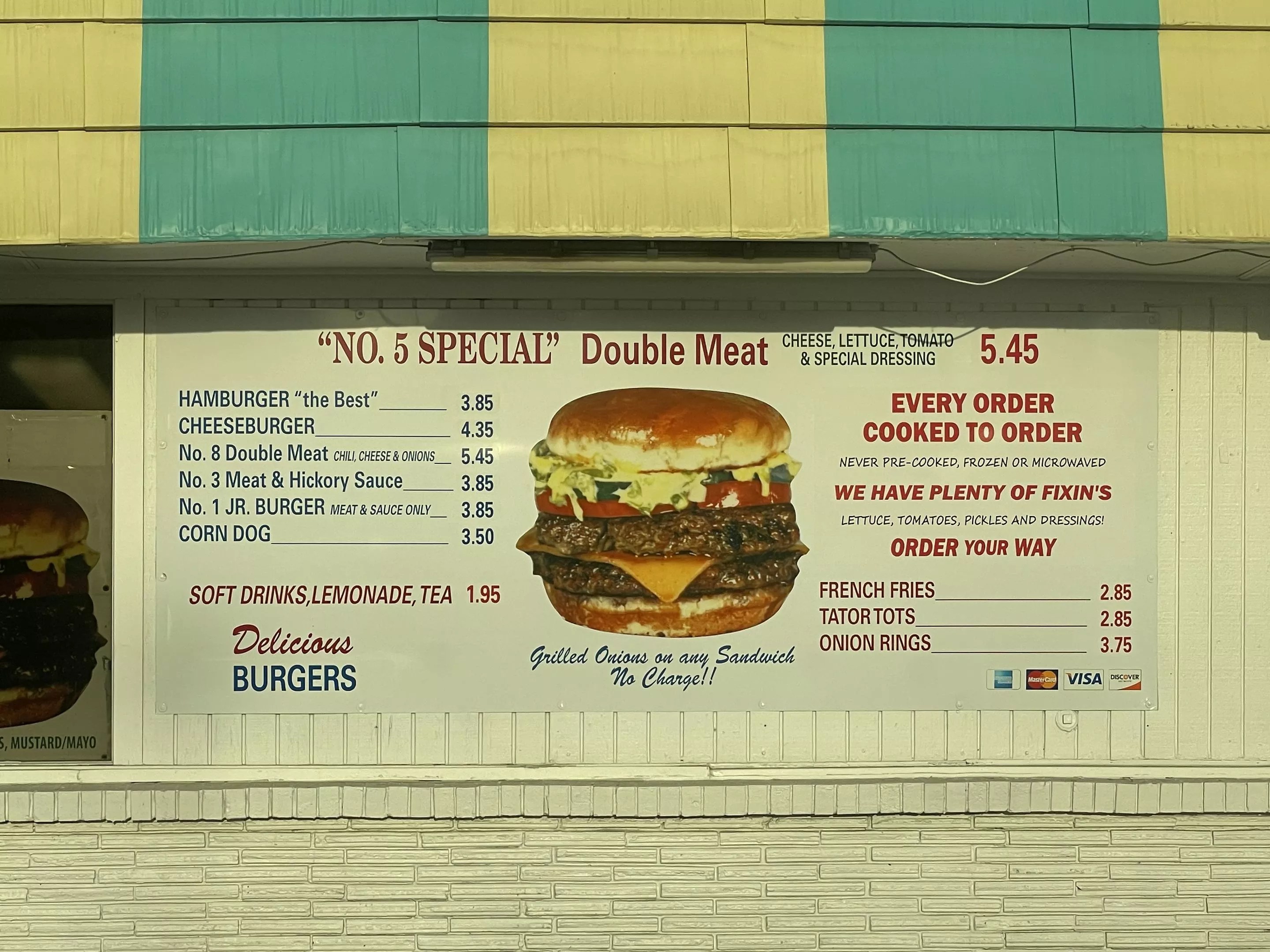 Six burgers (hamburger, cheeseburger, double meat, meat and hickory sauce, the No. 5 special and a junior burger) and a corndog for mains. French fries, tots or onion rings for sides. Add caramelized onions for free. Yes, free.