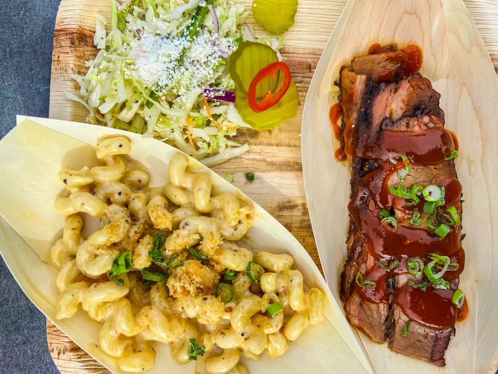 Last weekend, we opted for an entrée portion of sliced brisket ($18), which came with both cilantro slaw and a smoked gouda macaroni and cheese. Sliced brisket comes by default with Rathbun’s tangy barbecue sauce, but the brisket needs no help (purists should ask for sauce on the side if this offends their sensibilities). It was perfectly tender and delicious, even when we were served one of the last orders of the day. The slaw sparkles beneath a crumble of queso fresca, and the smoked Gouda mac made our taste buds happy with every forkful.