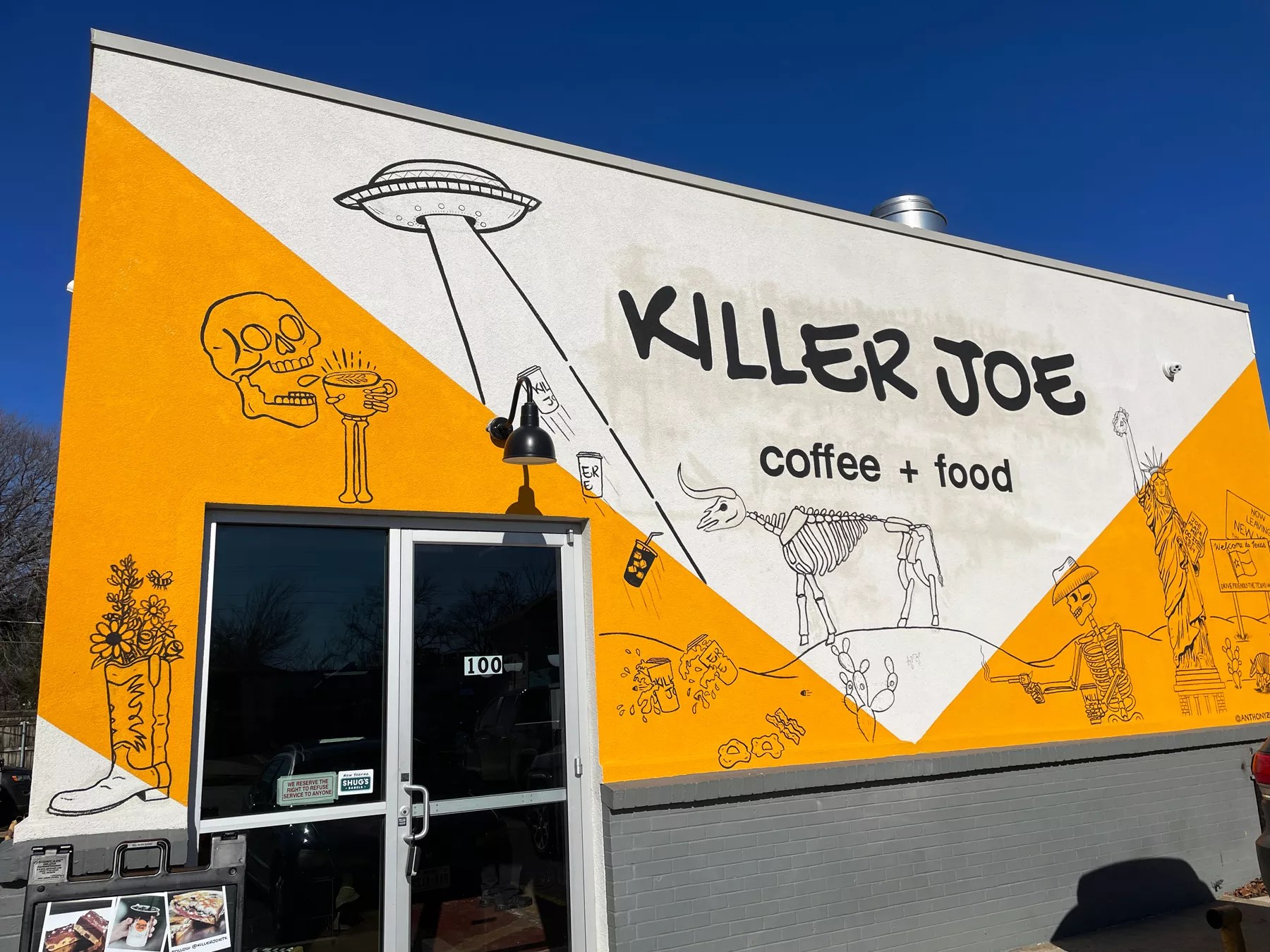 The mural outside of Killer Joe Coffee gives big “Welcome to Texas” vibes.