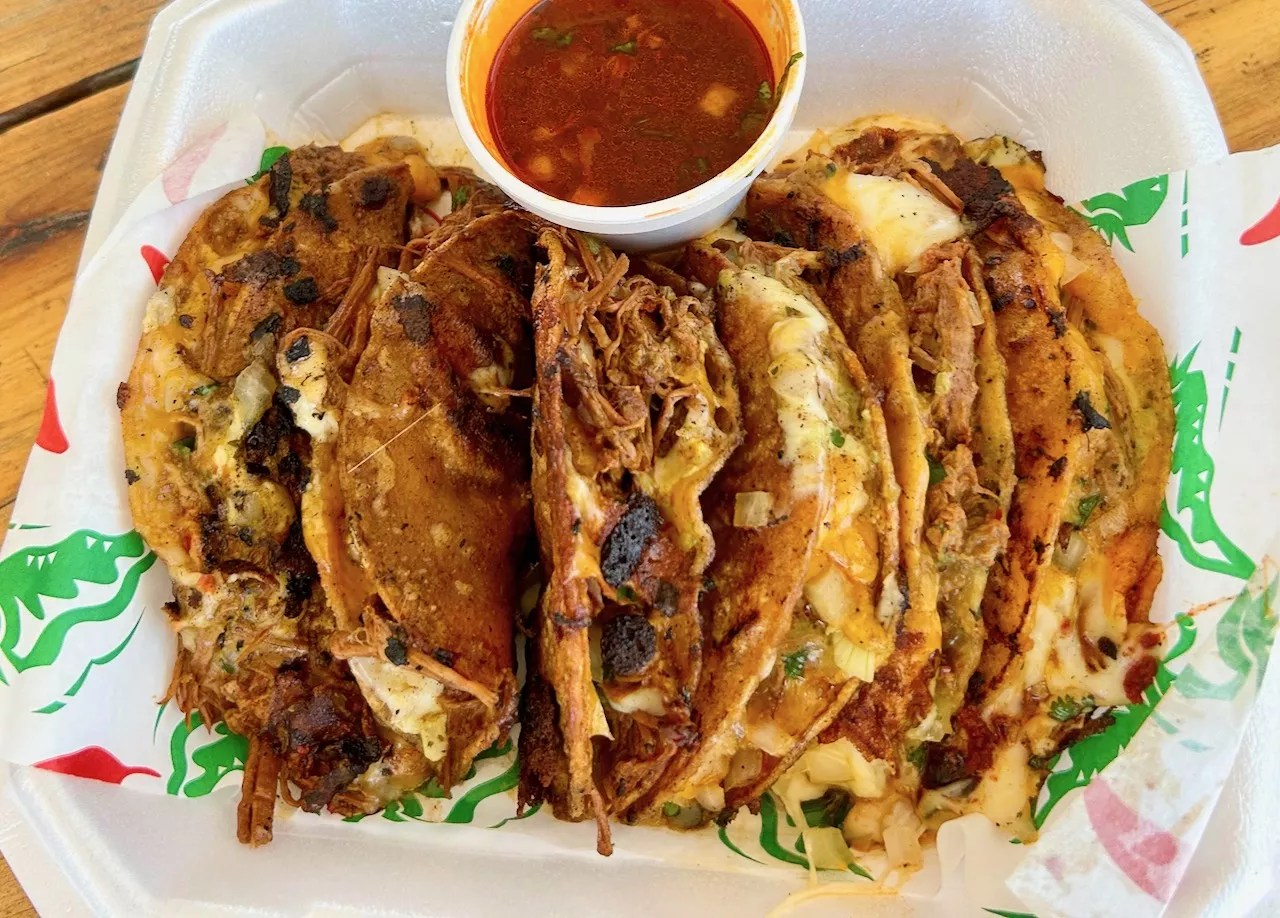 In his travels, Hernandez also acquired a birria recipe. Slow-simmered shredded beef soaks up broth, and is folded into a flour tortilla with cheese. It makes for a heavy, rich taco that has a bit of a crunch from the griddle.