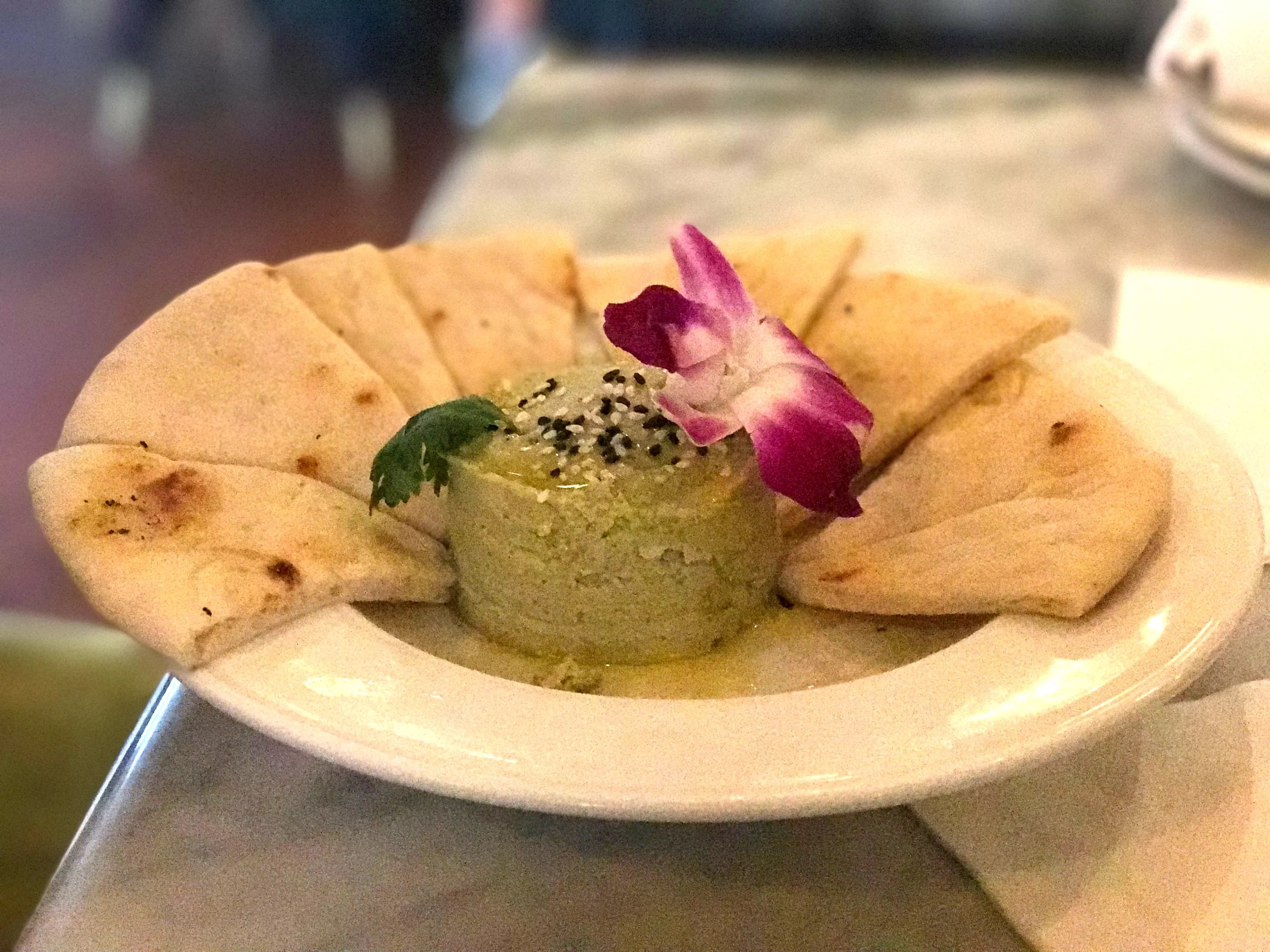 The edamame hummus () is bizarrely garnished with a purple orchid.