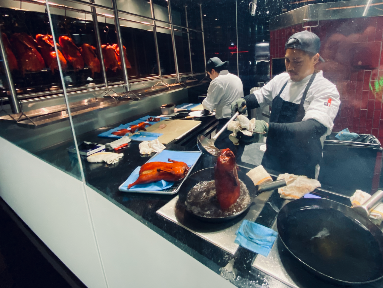 The restaurant is quite impressive, even from the outside. A doorman opens the large wooden doors and three hostesses with iPads at their fingertips greet you. Adjacent to the hostess stand is a Peking duck frying station with naked and fried red fowl hanging from hooks. It’s real in here.