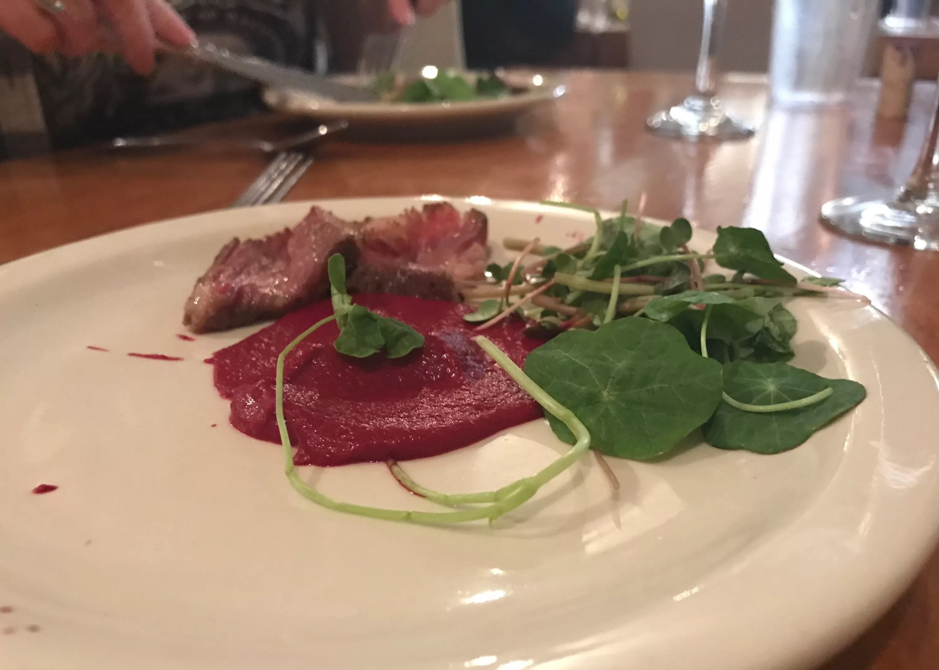 The first course of the evening, a beet puree with a tincture-kissed farmer’s market salad and sous vide Kobe beef seared with the tincture sprayed on top.