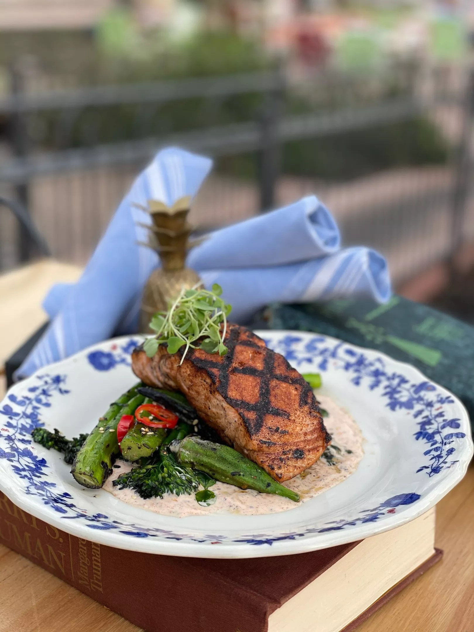 For a simple Southern meal during Lent, try the wood-grilled Atlantic salmon served with blistered okra and broccolini, Fresno peppers, spiced yogurt and sesame.