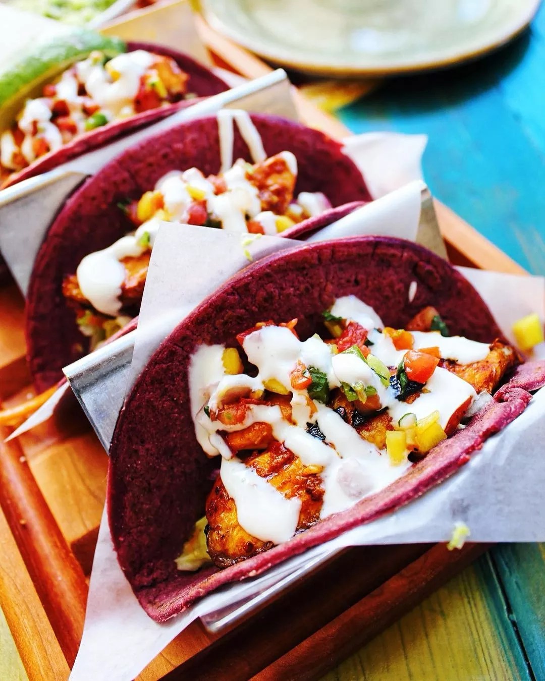 Pescado tacos are made with adobo-marinated whitefish served with avocado spread, pickled red onions, jicama slaw, lime crema and habanero mango pico on hibiscus tortillas.