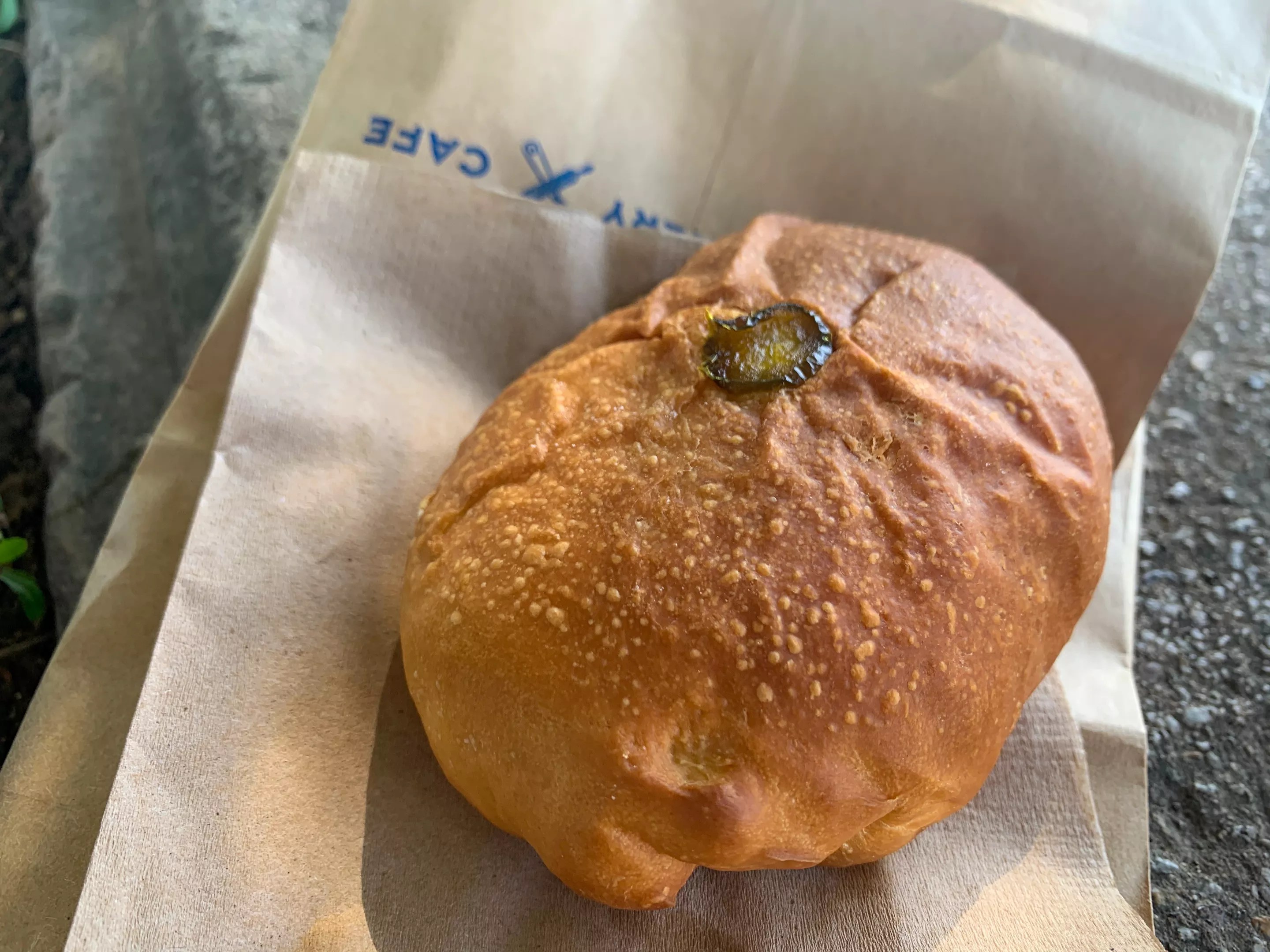 A wonderful klobasnek with sausage, cheese and candied jalape