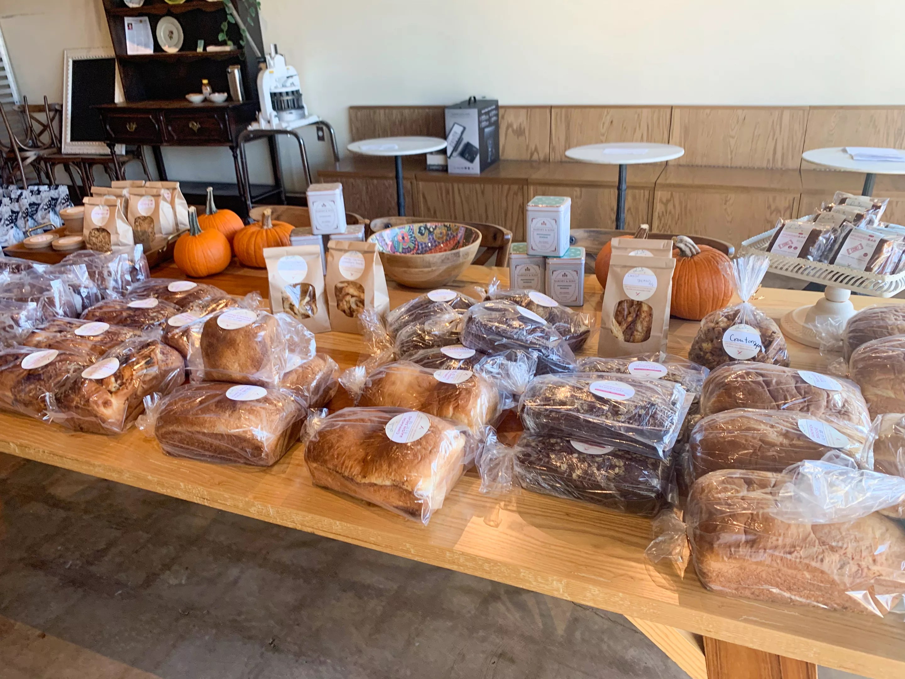 Now, that space where she envisioned diners sitting down, maybe drinking coffee and enjoying something sweet with friends, is an open room with a long table on it. While that, hopefully, one day could be used for a communal table, right now it’s packed with items you can grab quickly on the go. Fresh loaves of bread can easily up your sandwich game at home, so go ahead and grab one on the way to the glass case of baked goods.