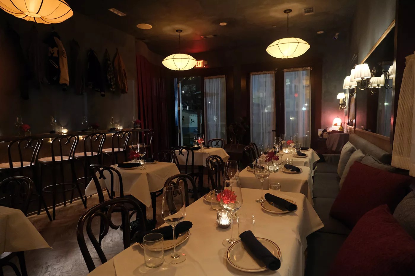 The home’s 980-square-foot interior has been reborn as a chic nook. Dusty blue walls, walnut wood paneling, dark mahogany trim and cushy bench seating backdrop crisp white linen tables. Each table is warmed with a candle and a single vibrant red rose. Dimmed bubble pendants, wall scones and accent lighting adds to the intimate ambience.