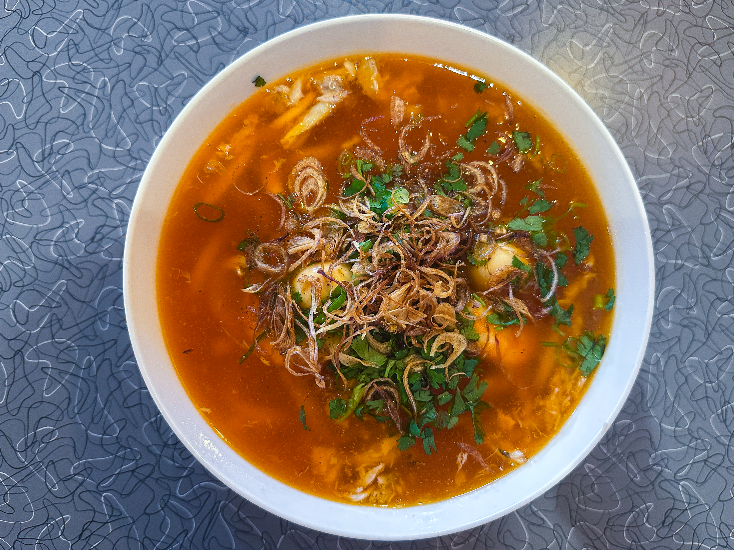 Bánh canh cua: crab tapioca noodle soup, but so much more, with shrimp, quail eggs, mushrooms, chicken, fried shallots and huyết.
