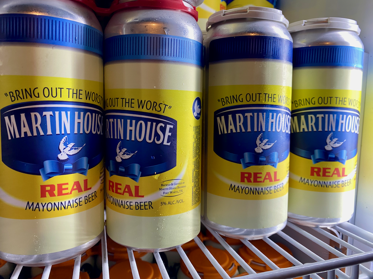 On Saturday after a late breakfast, I wasn’t far from the Fort Worth brewery and cajoled an innocent family member into hopping over to the banks of the Trinity to see about this beer. For fun. We both have a mild amount of disdain for blobs of egg-based gelatinous condiments, so this impromptu decision channeled don’t-think-about-it-just-do-it energy. Or stupid human tricks.