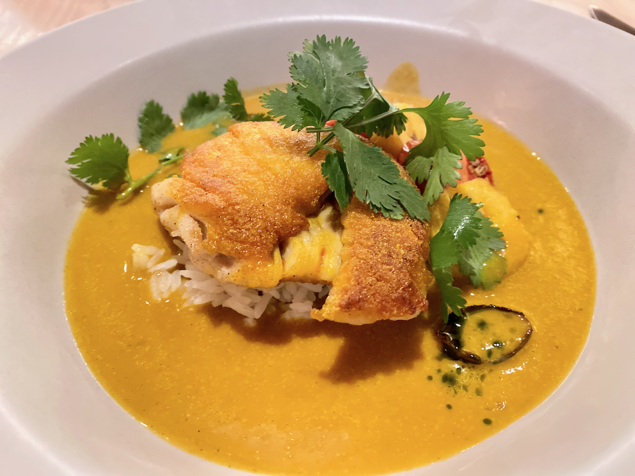 For $73 a diner gets four courses, with three to four dishes to choose from for each course. There’s no skipping or eighty-sixing a course. Four plates will arrive in front of you. Usually, there’s a vegetarian option, fish, and, of course, a carnivore dish. Moqueca is a traditional Brazilian dish and a signature item at Meridian. Here it’s served with flakey skate. Lauren Drewes Daniels