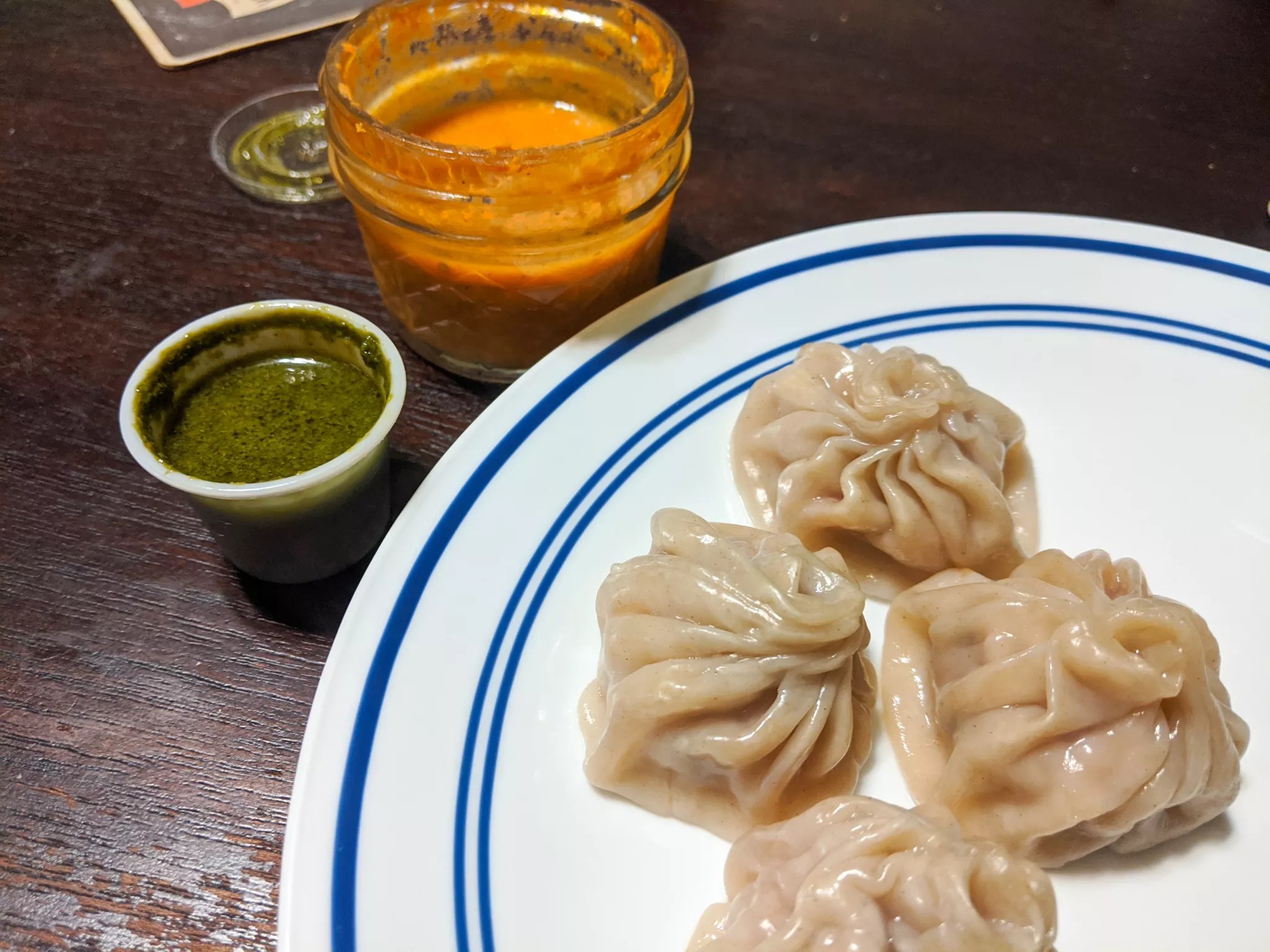 Instructions for preparing the momos are on Momo Shack’s website, and they’re simple. Steam them – making sure to grease the surface the dumplings sit on, an instruction I ignored the first time and will never forget again – or pan fry. The momos themselves are spectacular; don’t be concerned if the pork is a little bit pink, because it’s full of colorful seasoning.